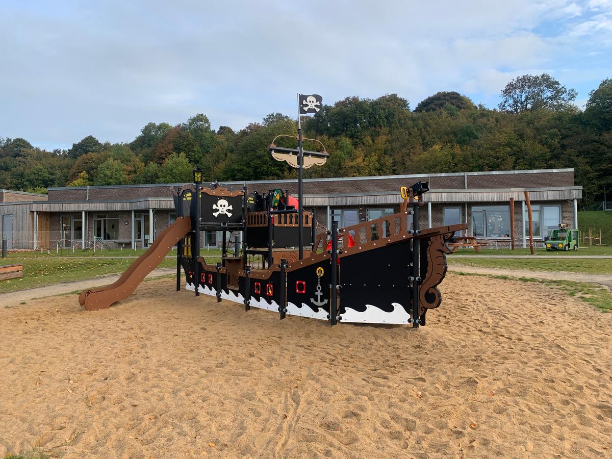 Stort piratskepp för lekplatser som kombinerar klättring, höjdlek och rutschkana med ett rikt pirattema som stimulerar barns fantasi, balans, styrka och rollekslek.