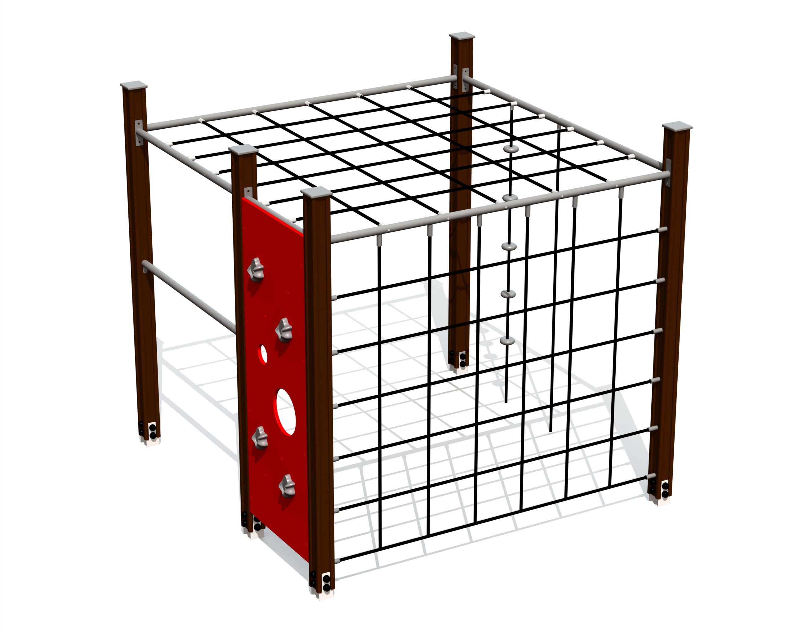 Mångsidig klätterlösning med nät, stege, horisontell stång och klätterrep.