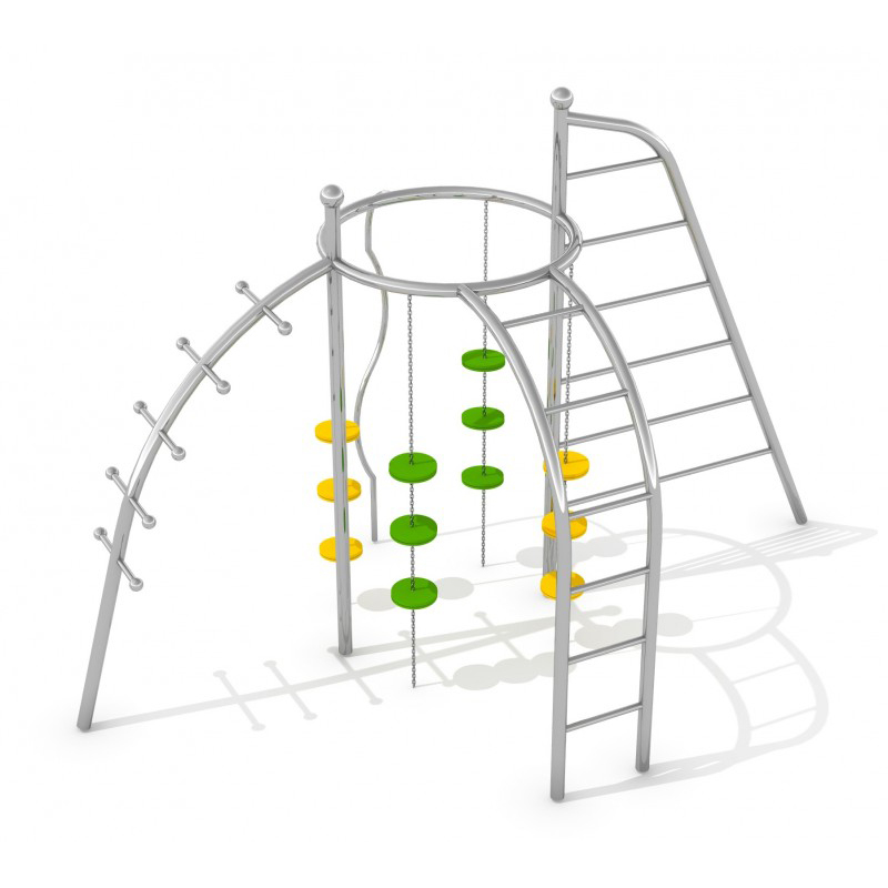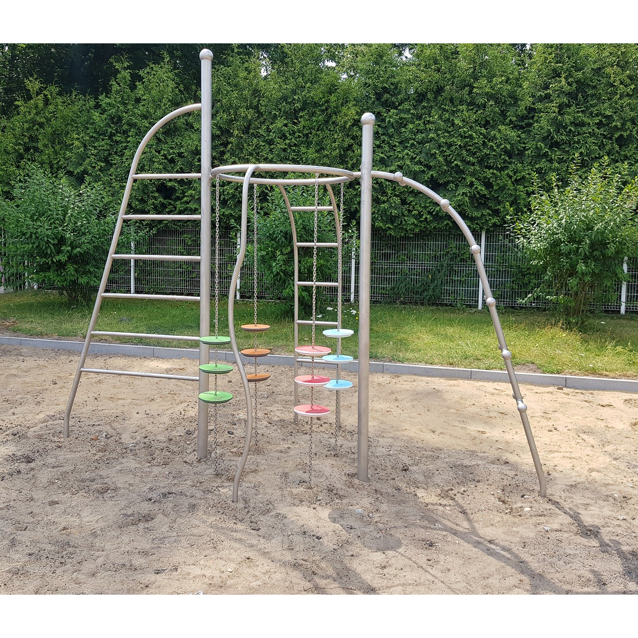 Klätterställning i rostfritt stål med dekorativa kulavslut. Golvet är tillverkat av halkfri HPL som ger säker användning i alla väder. Konstruktionen inkluderar stegar, ringar, kedjor och brandmansstång. Avsedd för tonåringar och intensiv användning. Finns även i galvaniserad och pulverlackerad version.
