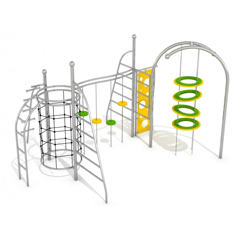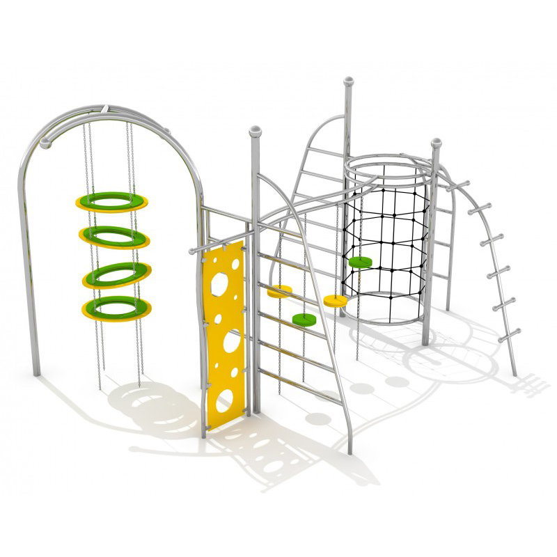 Klätterställning i rostfritt stål med halkfri HPL-plattform. Utformad som träningsredskap för ungdomar och anpassad för intensiv användning. Slitstark och vädertålig konstruktion.