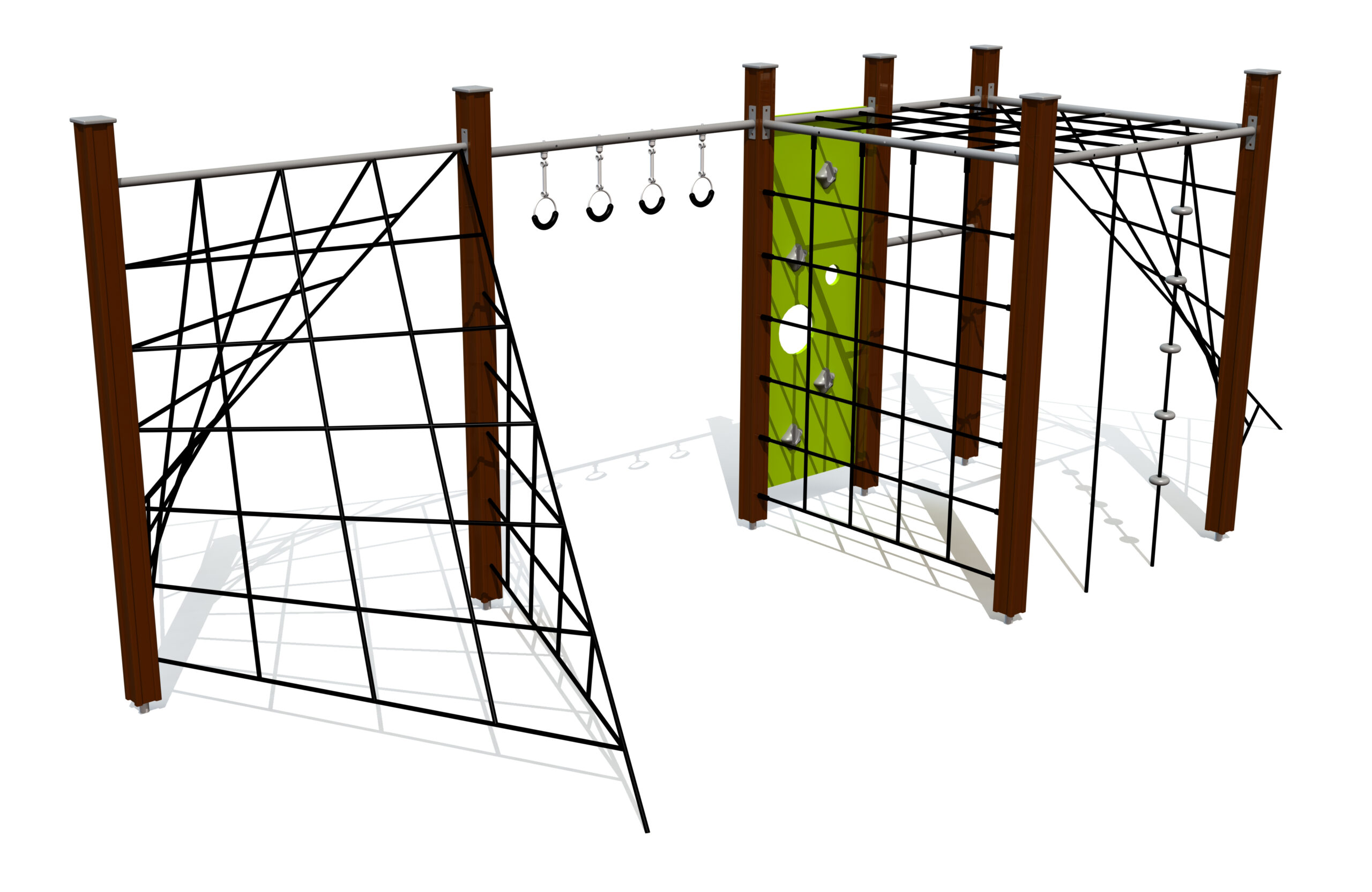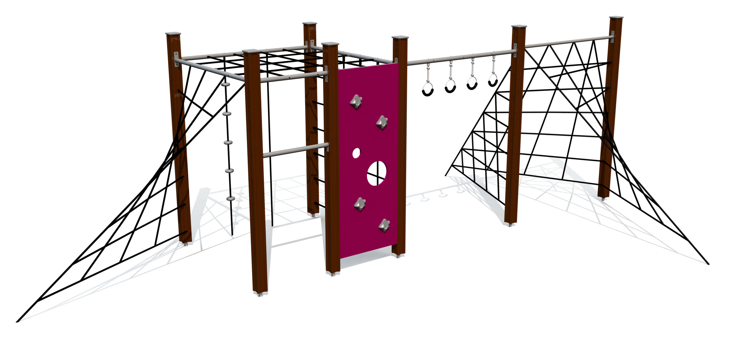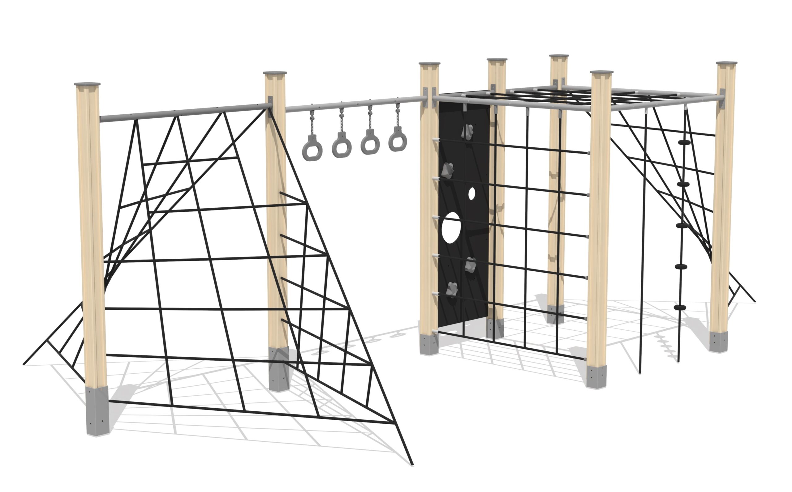 En kompakt men variationsrik klätterställning som uppmuntrar aktiv lek, styrka och koordination genom flera olika klättermoment.
