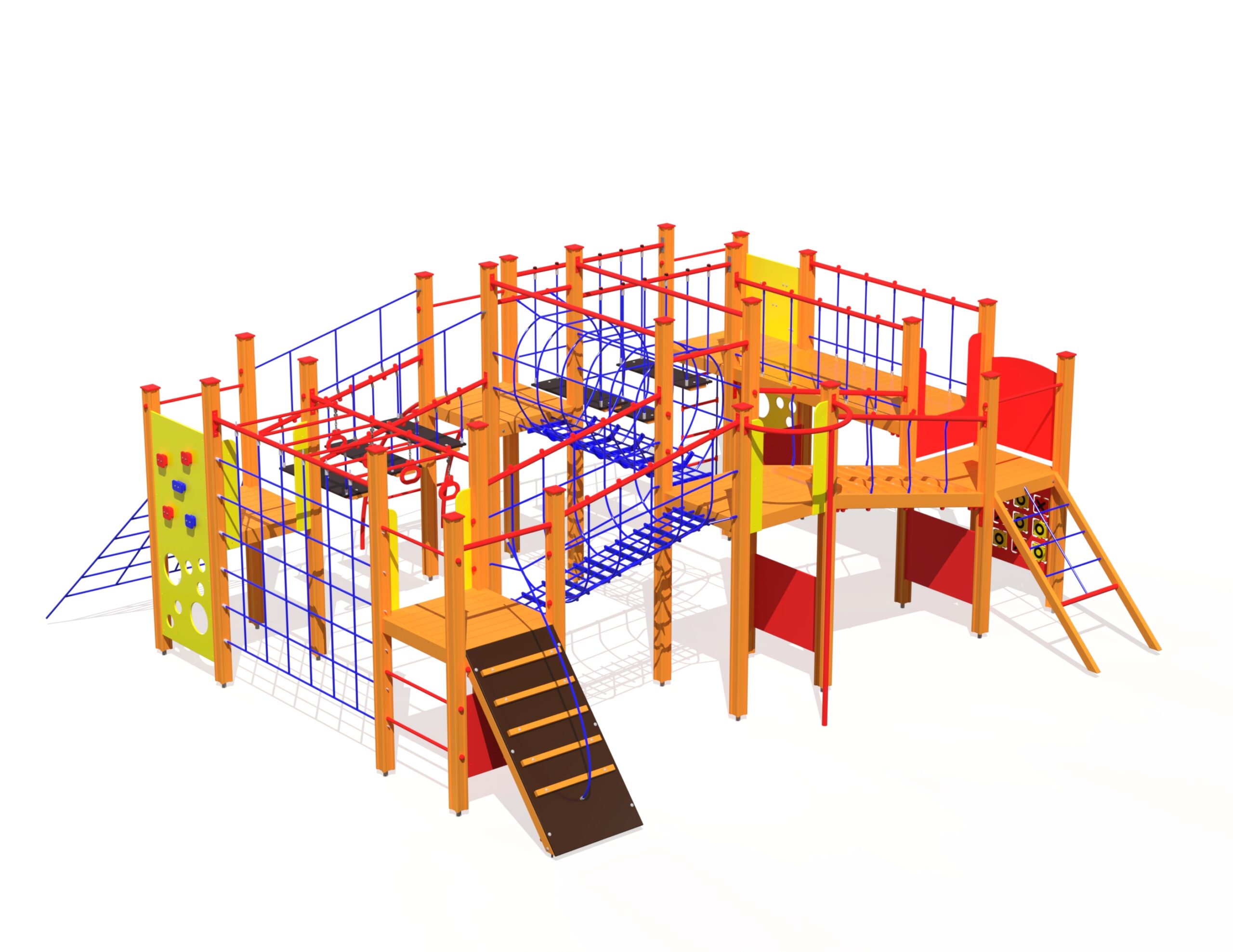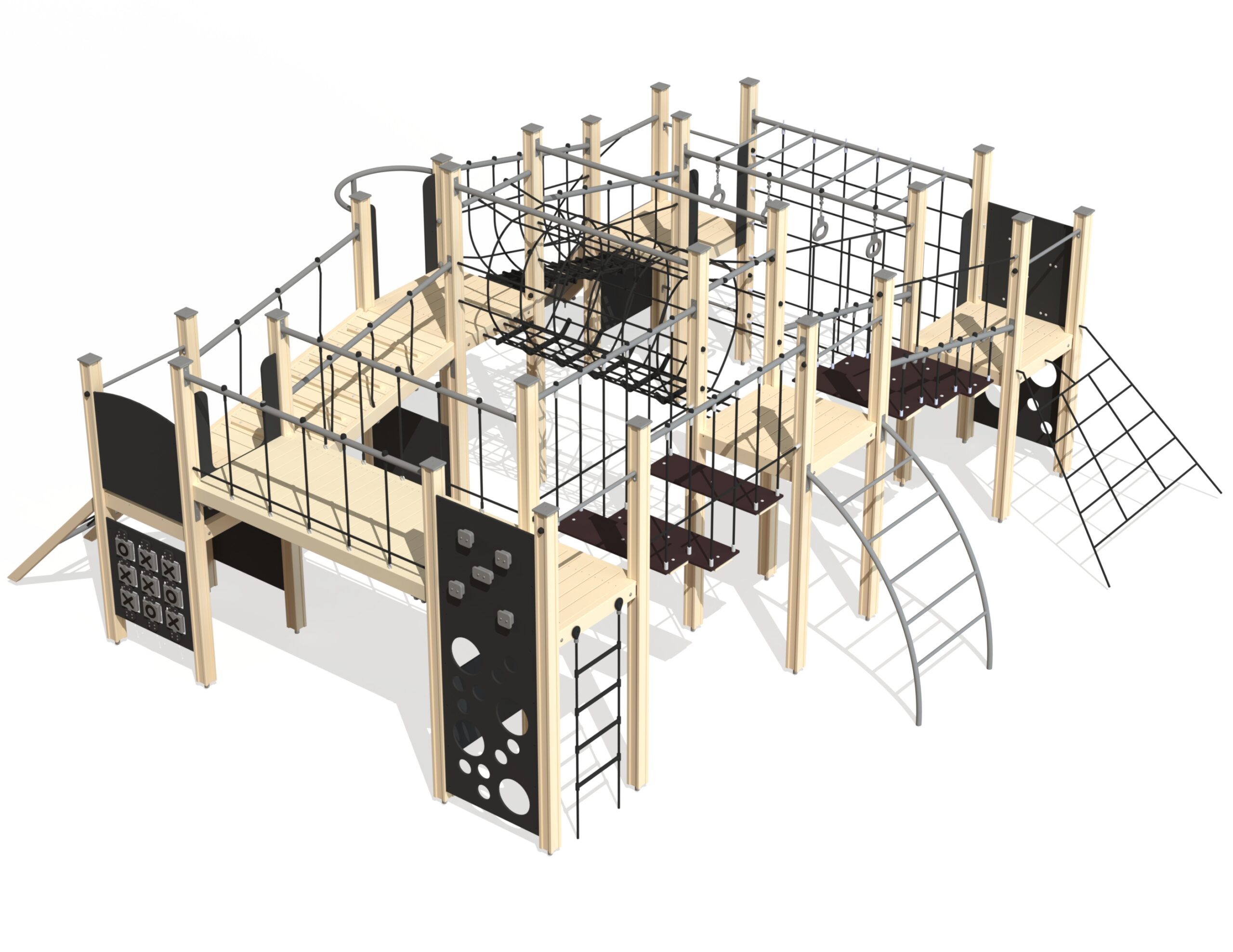 Stort klätterkomplex med broar, klätterelement och monkey bars.