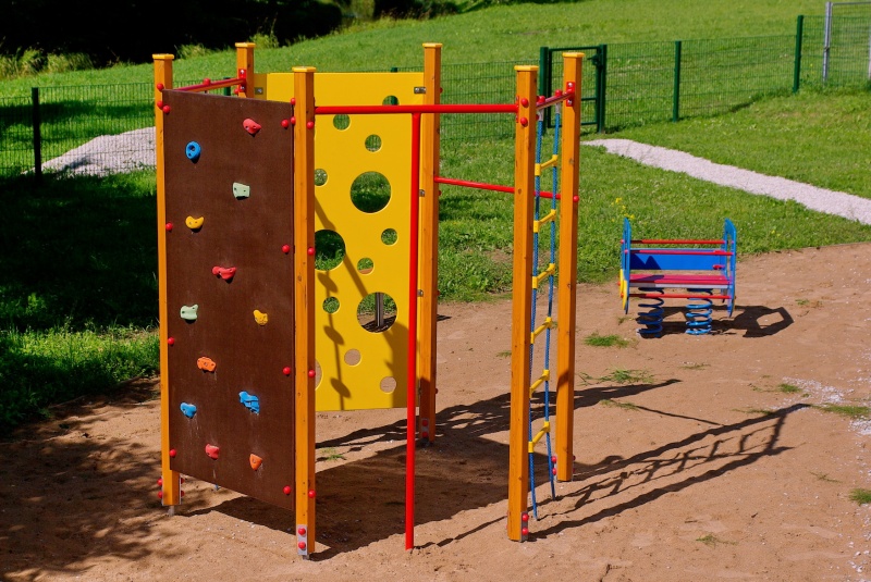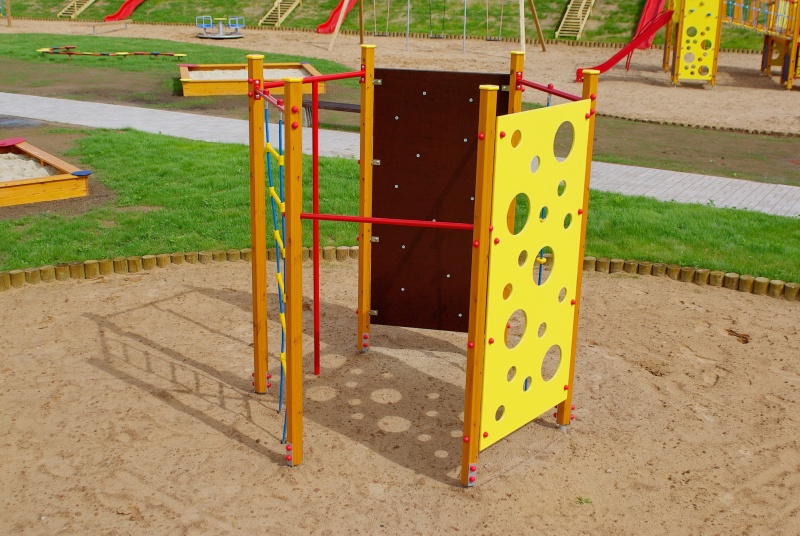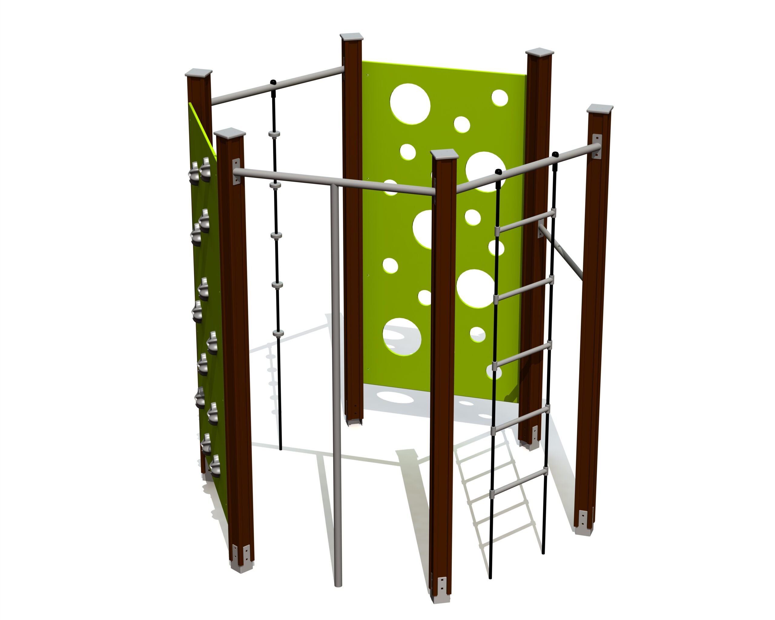 Klätterutrustning med flera klättervägar och brandmansstång. Utformad för aktiv och varierad klätterlek.