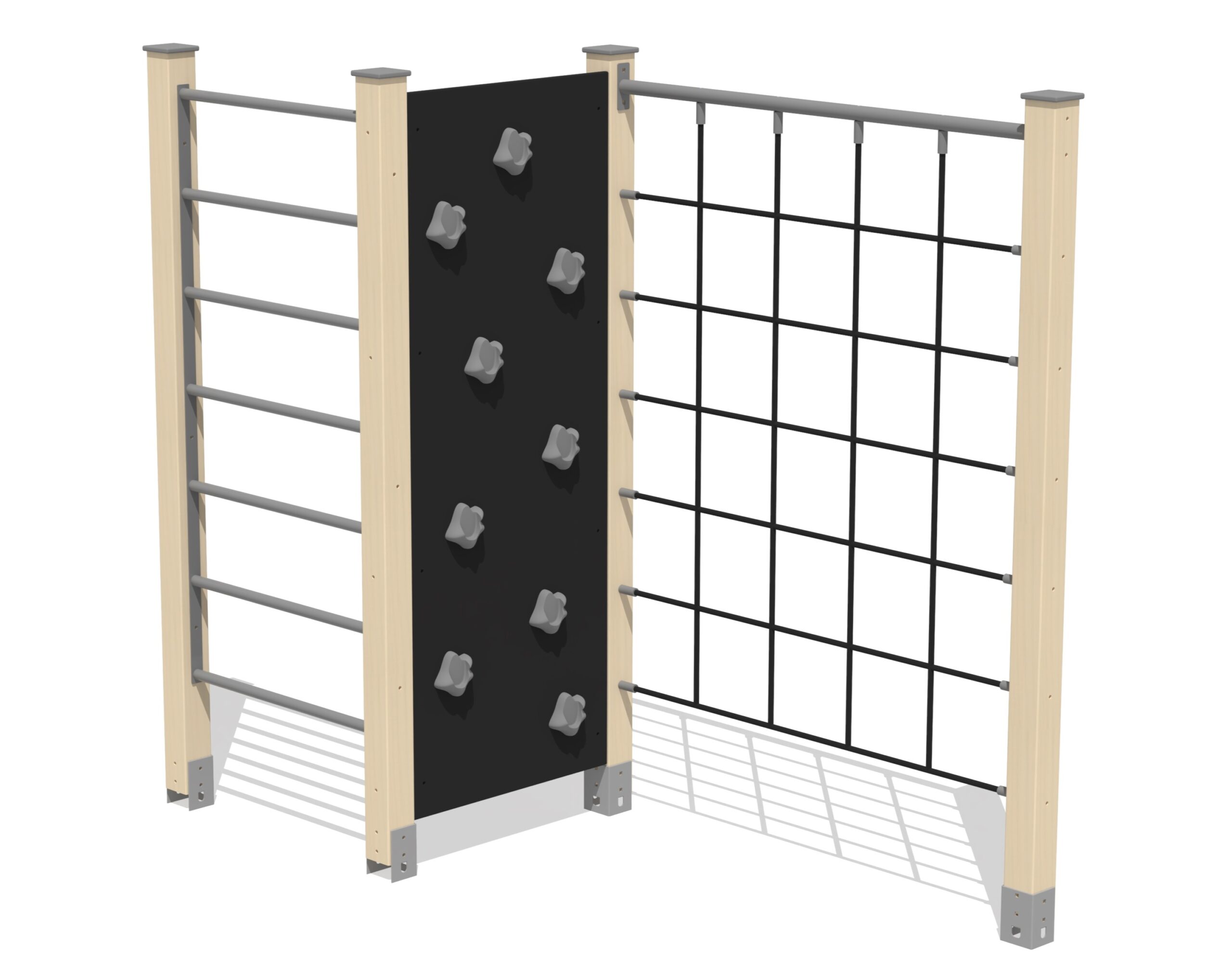 Trendig tredelad klätterlösning som kombinerar klättervägg, stege och klätternät för aktiv och varierad rörelselek.