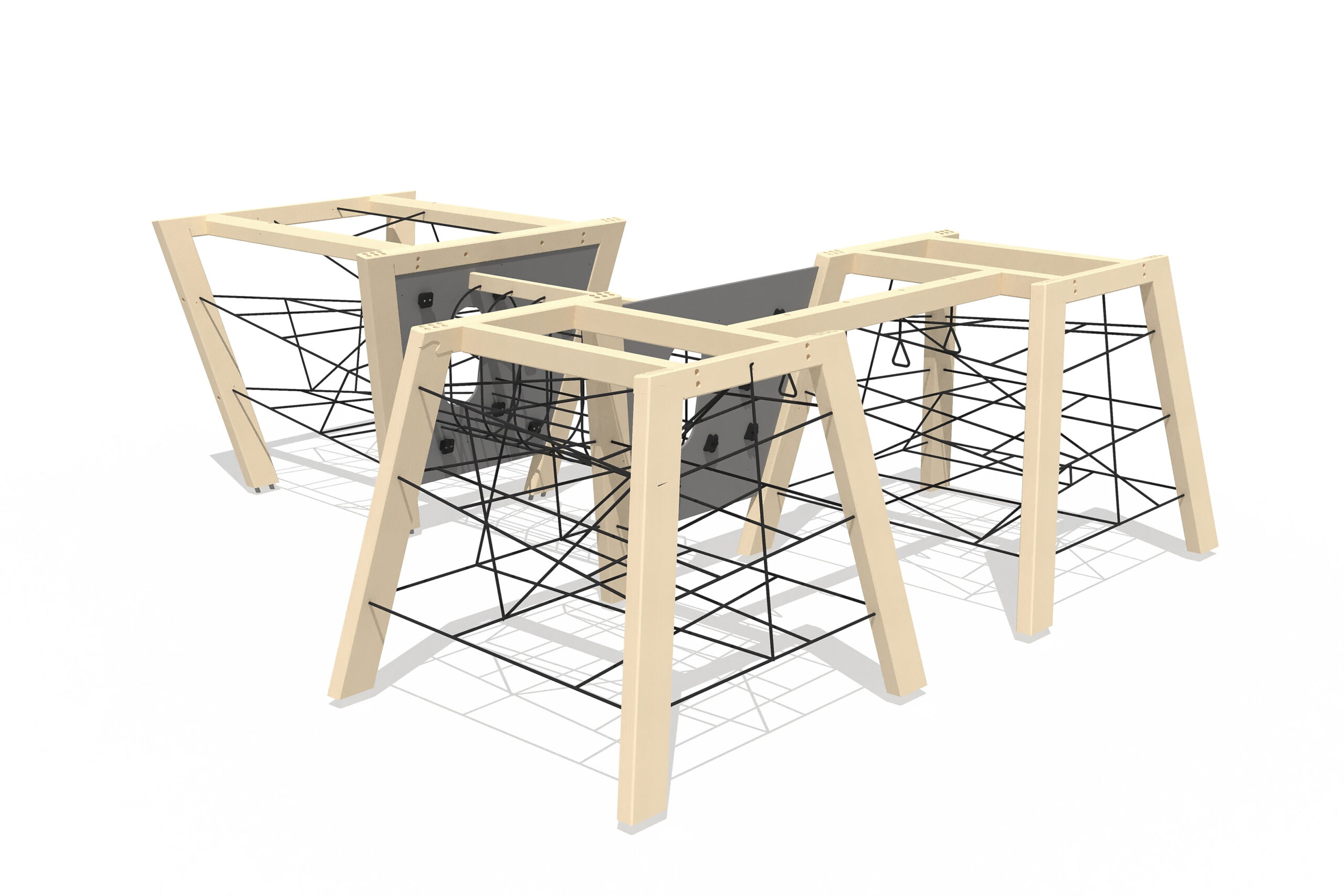Klätterställning i AMAZON-serien för offentlig utemiljö som stödjer klättring, balans och koordination i naturlig färgsättning.
