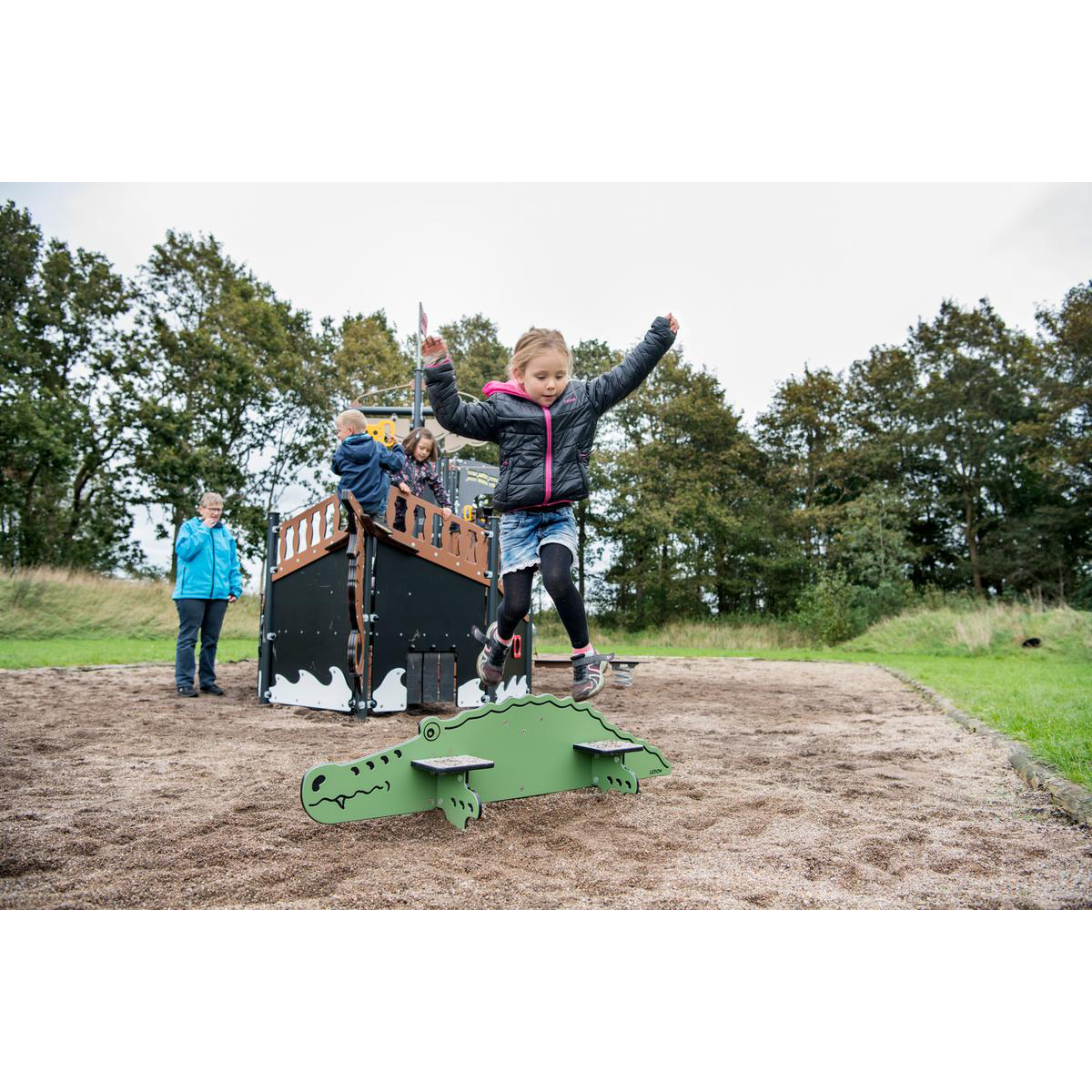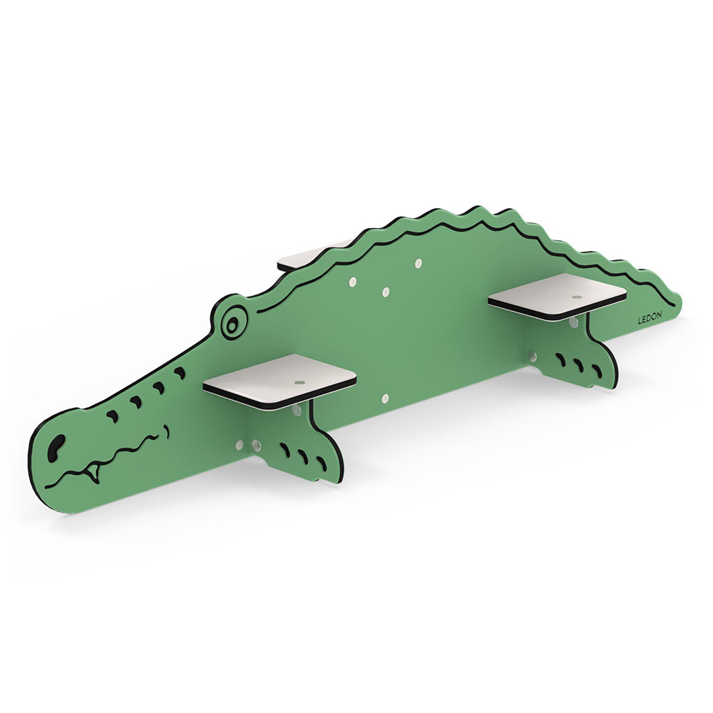 Kliv över den knäppande krokodilen Vår krokodil har tre steg på två nivåer. När de leker på krokodilen måste barn koncentrera sig när de går från ett steg till nästa. Detta tränar både deras balans och deras ögon-fotkoordination. Det senare är särskilt viktigt för utvecklingen av barns finmotorik. Det kan tyckas ologiskt, men i själva verket måste barn utveckla ögon-fot-koordination innan de börjar utveckla ögon-hand-koordination, som de använder när de håller i verktyg eller lär sig skriva. Skapar en sammanhängande lekplats På lekplatsen kan krokodilen tjäna två syften. Det är en rolig balansutrustning som kan stå för sig själv eller vara en del av en större hinderbana. Samtidigt väcker dess tematiska design också barns kreativitet och fantasifulla lek. Den passar perfekt in i piratuniversumet, men kan lätt ingå i andra temavärldar också. Till exempel i LEDON Explores djupa djungel eller i en LEDON Castle vallgrav. Varför välja LEDON Pirates? Lekaktiviteterna på piratlekplatsen är till 100 % inspirerade av barn och bygger på barns idéer om lekaktiviteter med pirattema. I Pirates har flera innovativa lekaktiviteter utformats som stimulerar till rollspel, social interaktion och fysisk lek, till exempel den vingliga plankan. Fartygen finns i många olika prisklasser och nya element kan enkelt läggas till i universum. Piratskeppen är indelade i zoner så att flera åldersgrupper kan leka samtidigt utan att störa varandra.