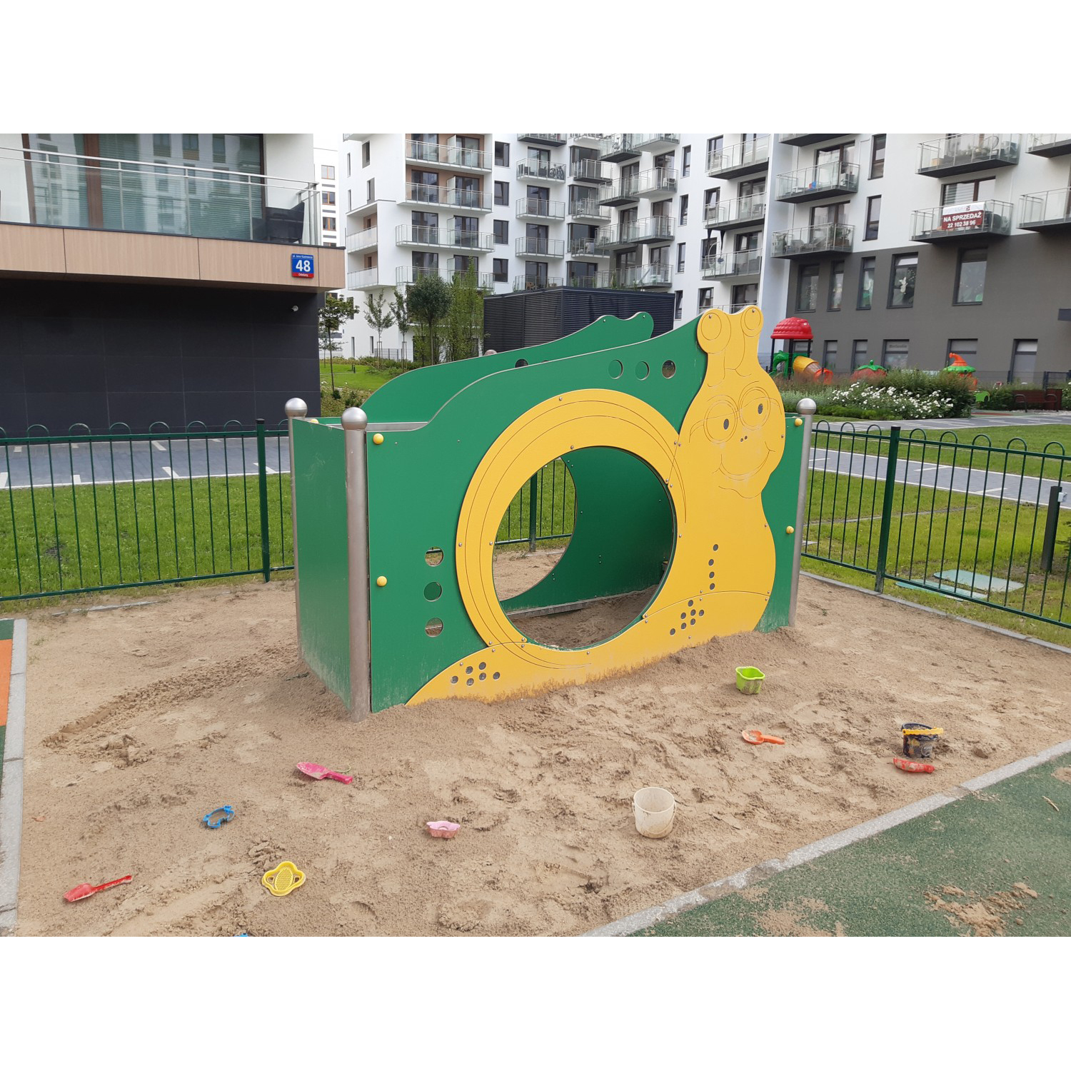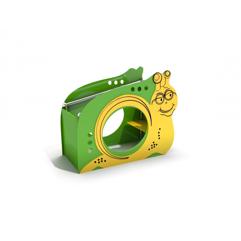 Lekstuga med två bänkar och väggar med hål. Designen hämtar sin inspiration från formen av en snigel. En högpresterande, väderbeständig svetsad konstruktion av rostfritt stål (inga klämmor används). Stolparna är avslutade med sfäriska d