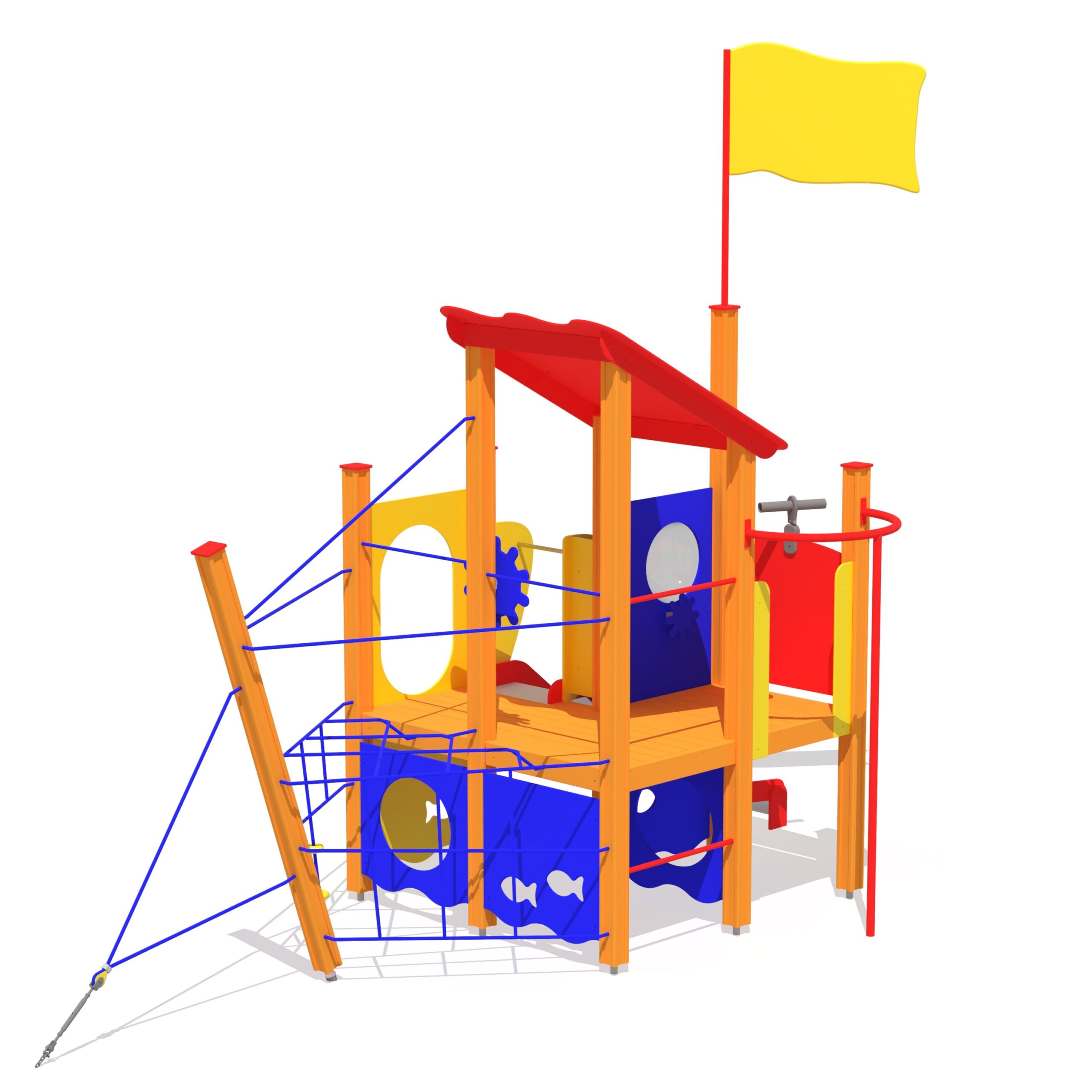 Stort lekskepp i två nivåer som bjuder in till samarbete och fantasifull lek. Rymmer många barn samtidigt.