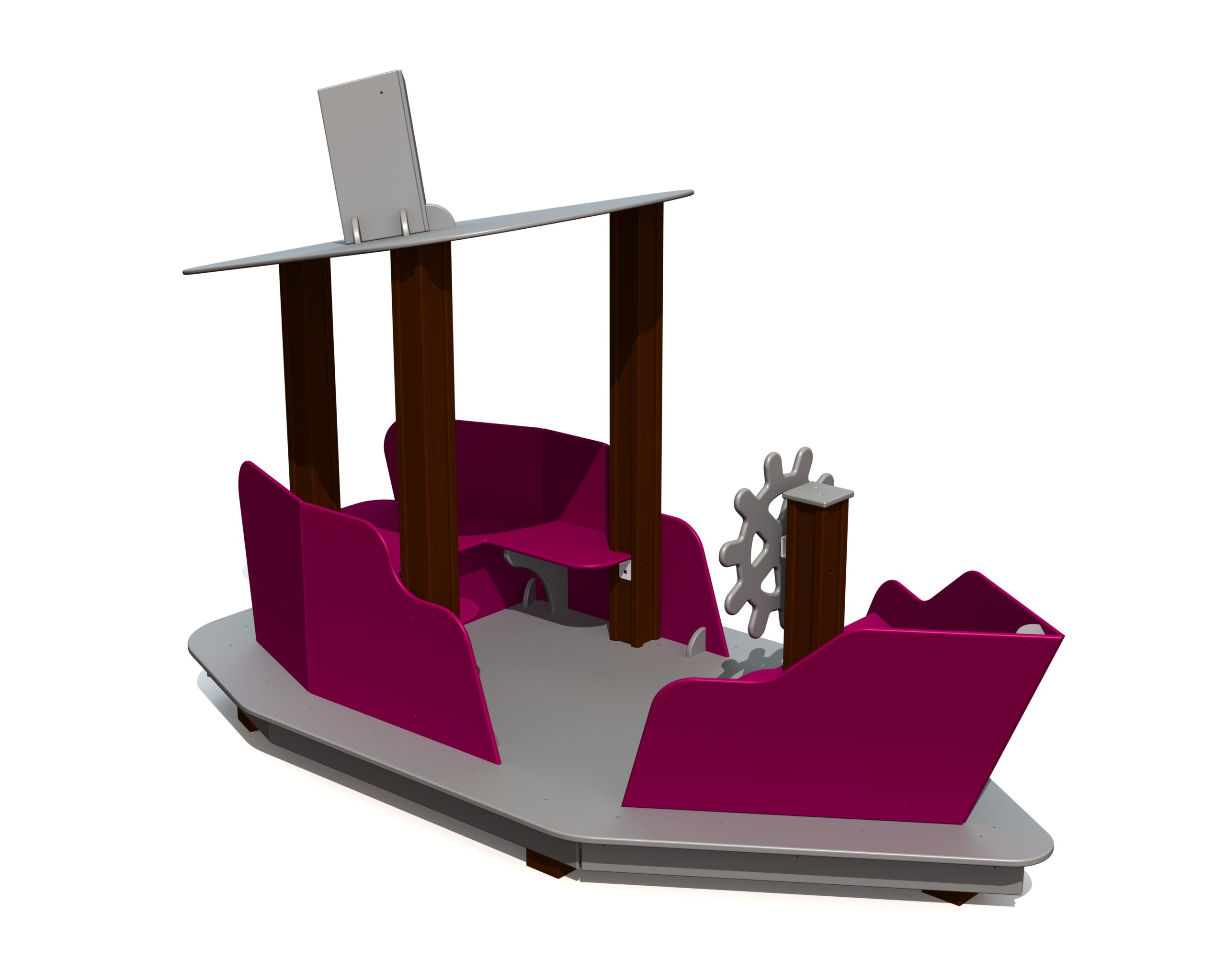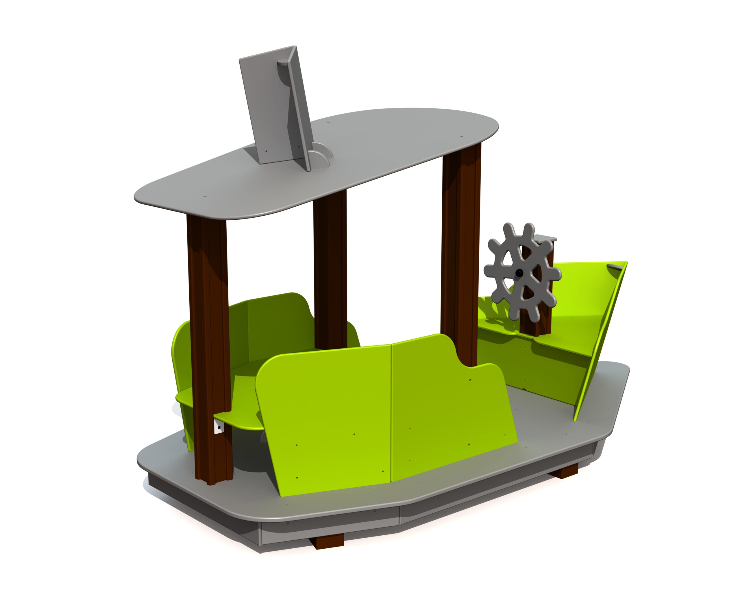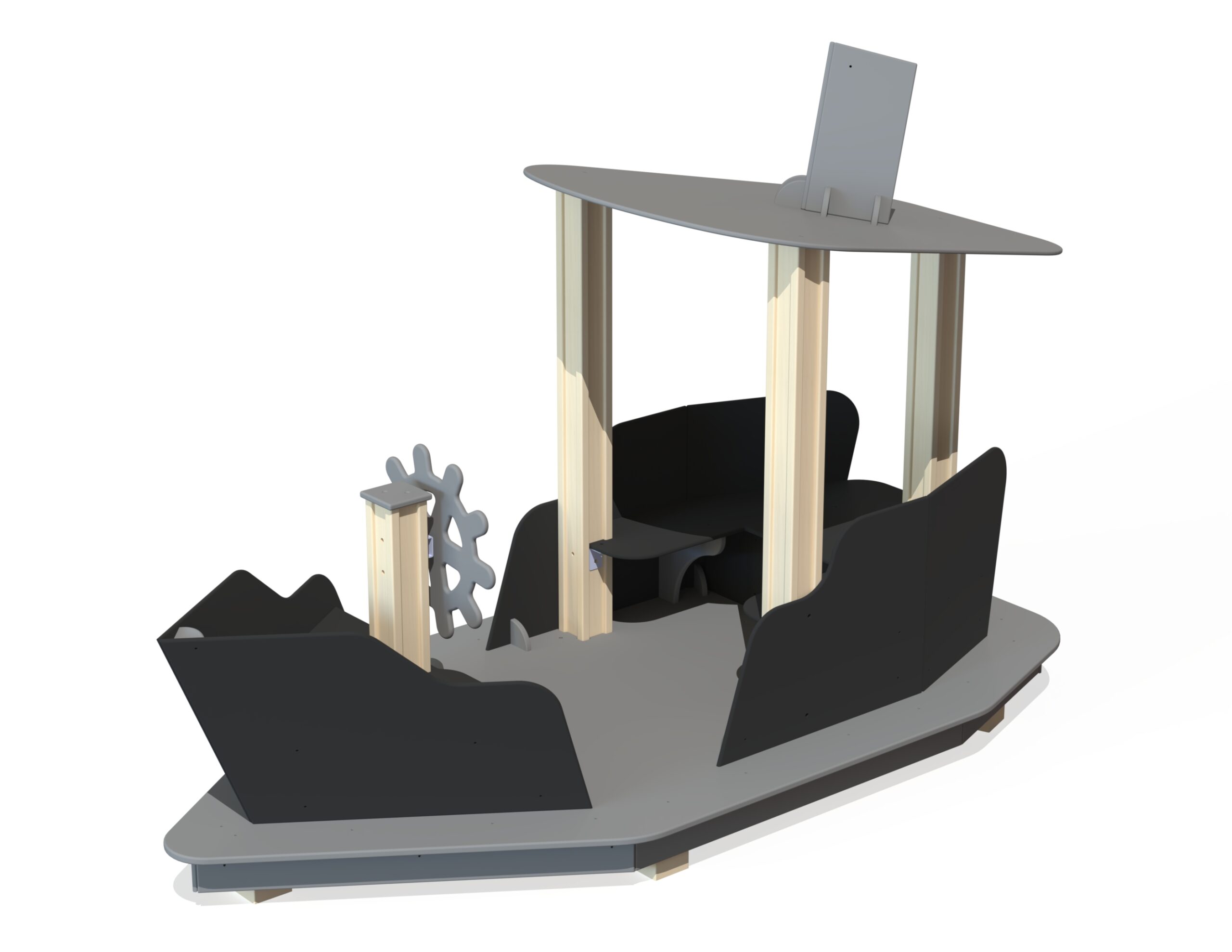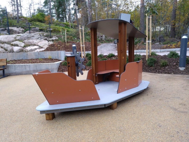 Lekbåten UKU är designad för små barn som vill segla och leka kapten. Båten har en roterande ratt, en skyddande hytt med tak samt en bekväm sittgrupp. Utformningen skapar en trygg miljö för fantasifull lek och gemensamma äventyr.