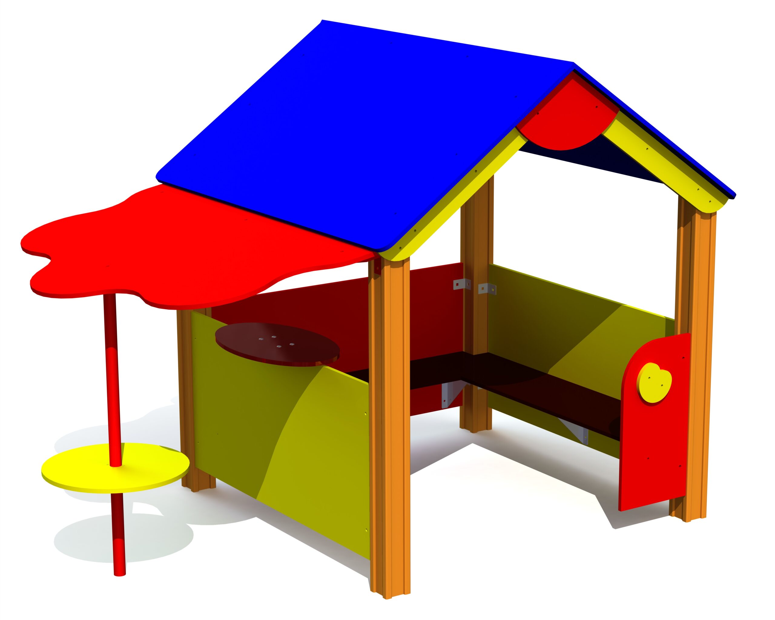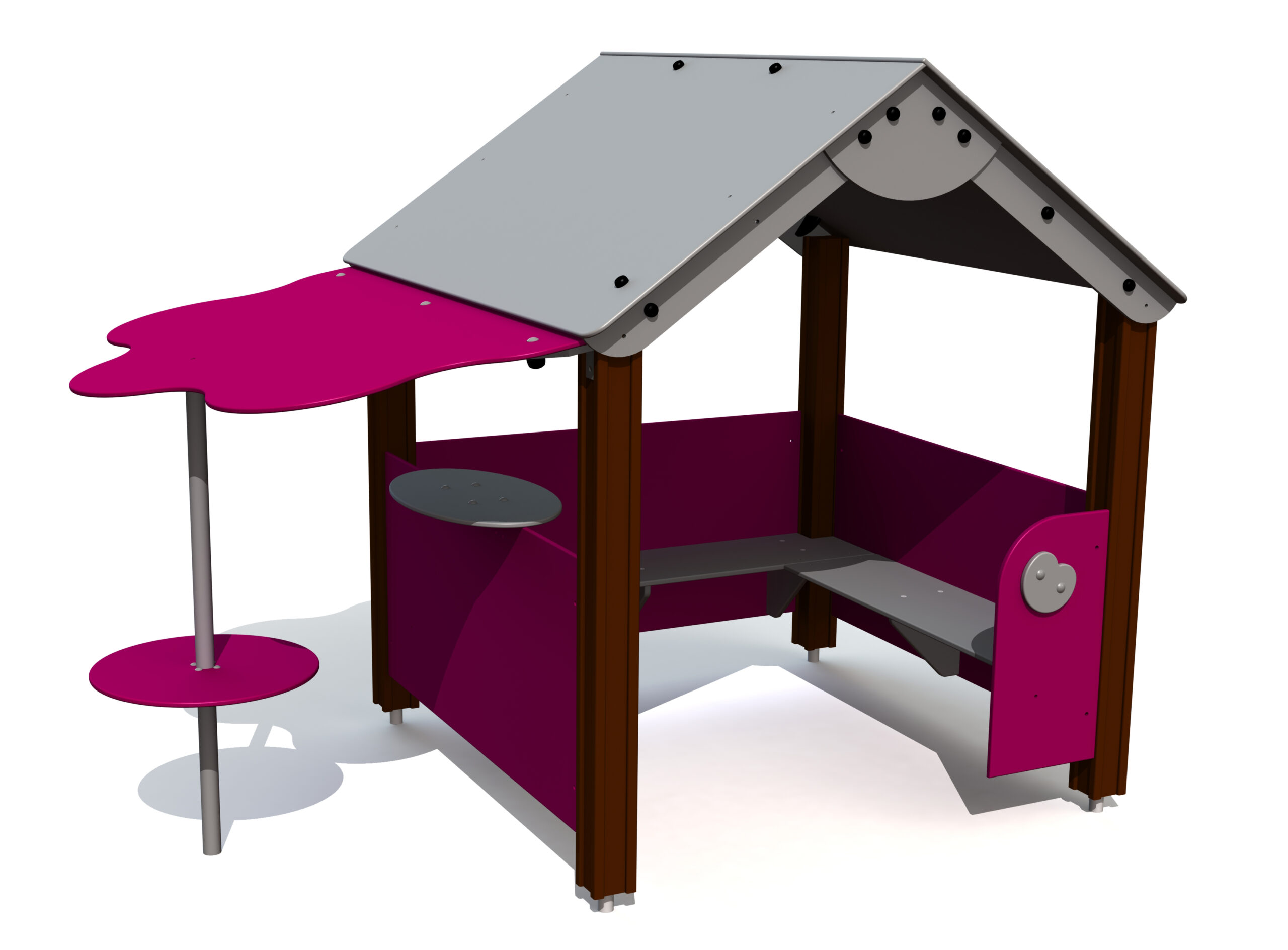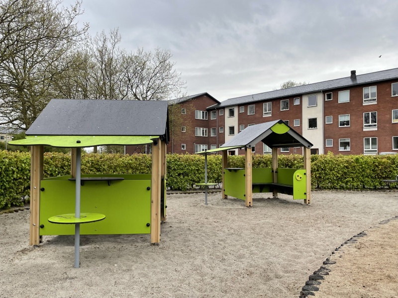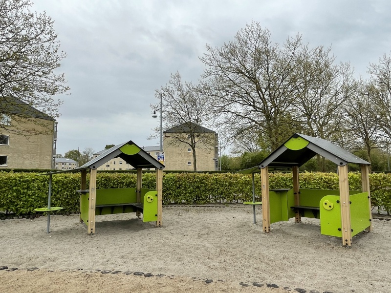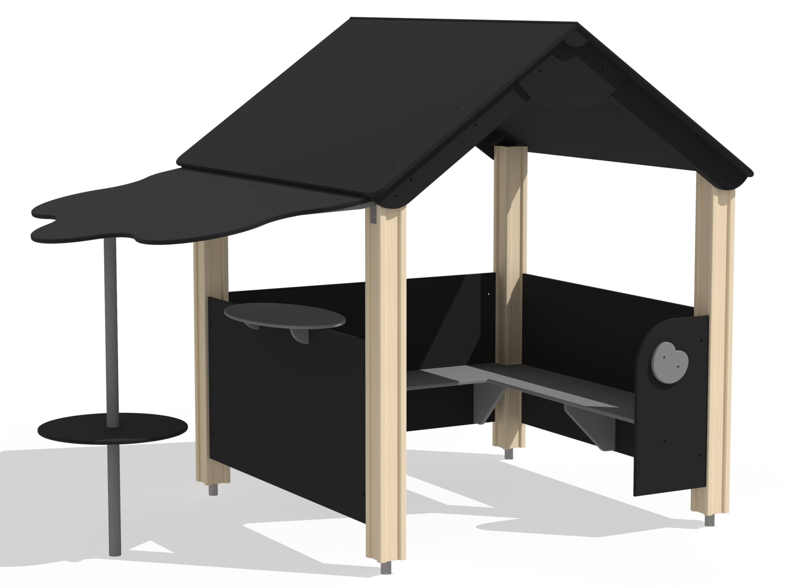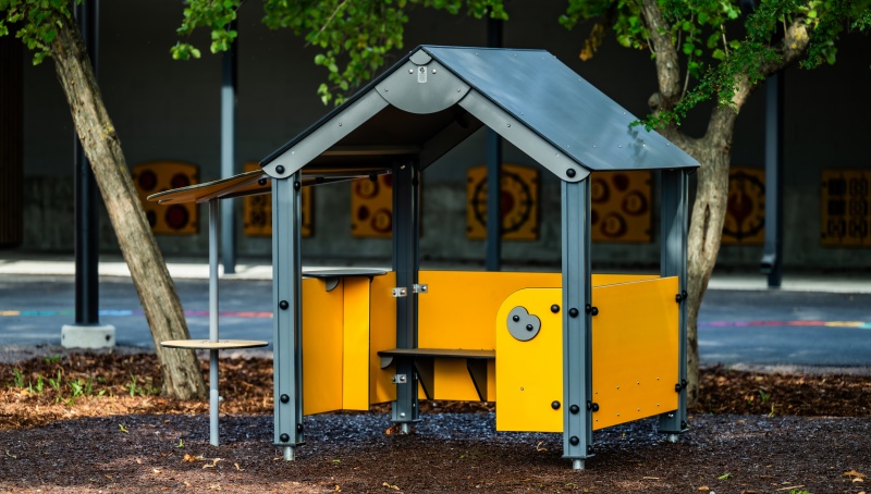 Playhouse ÄPPLE är ett härligt takhus där barn kan leka många lekar och ta skydd mot regn och sol. Inne i huset finns bänkar på två sidor som bekvämt har plats för 8-10 barn. På den tredje sidan finns ett ovalt bord för spel och på andra sidan av huset finns ett härligt skydd med en sittplats som liknar ett äppelträd.