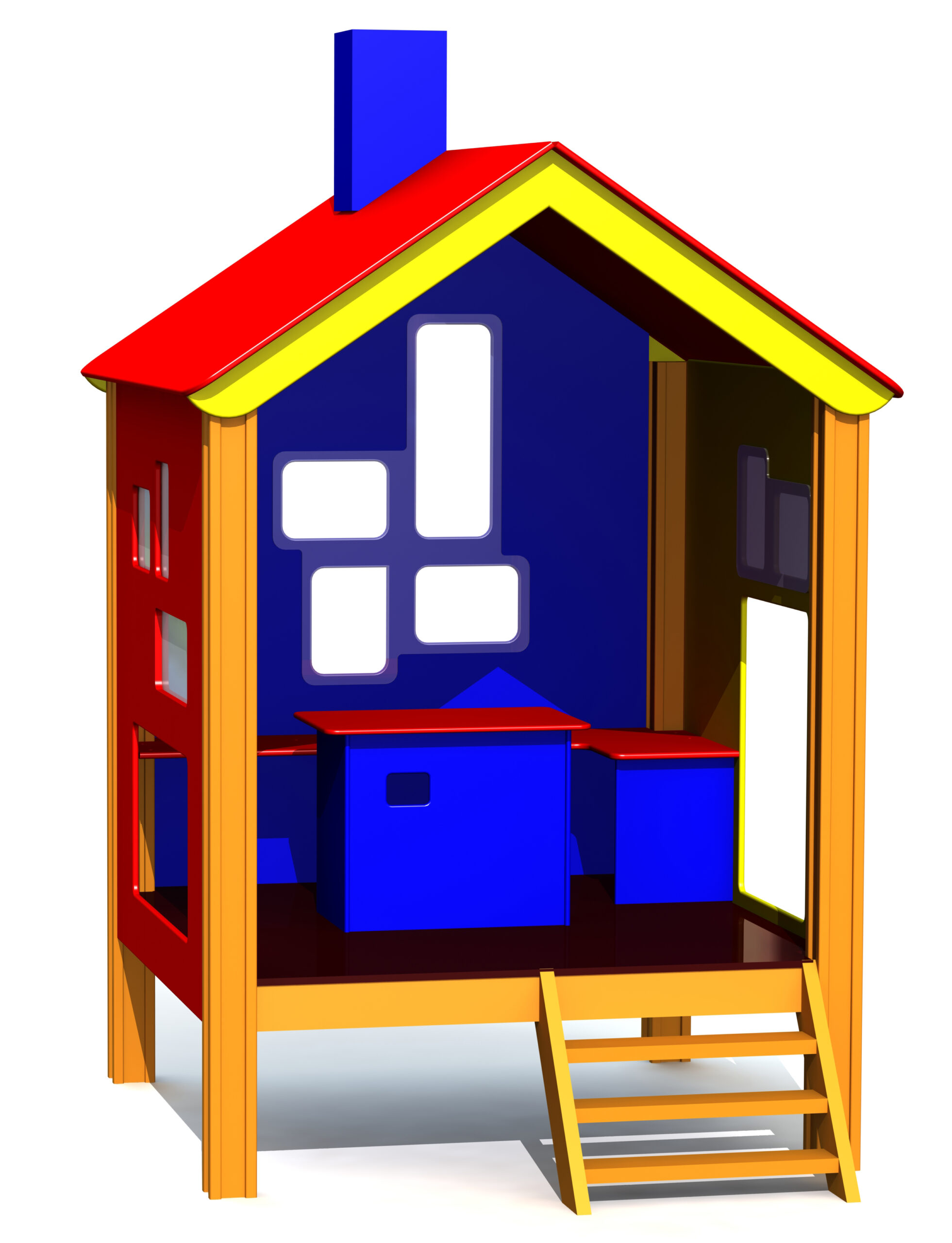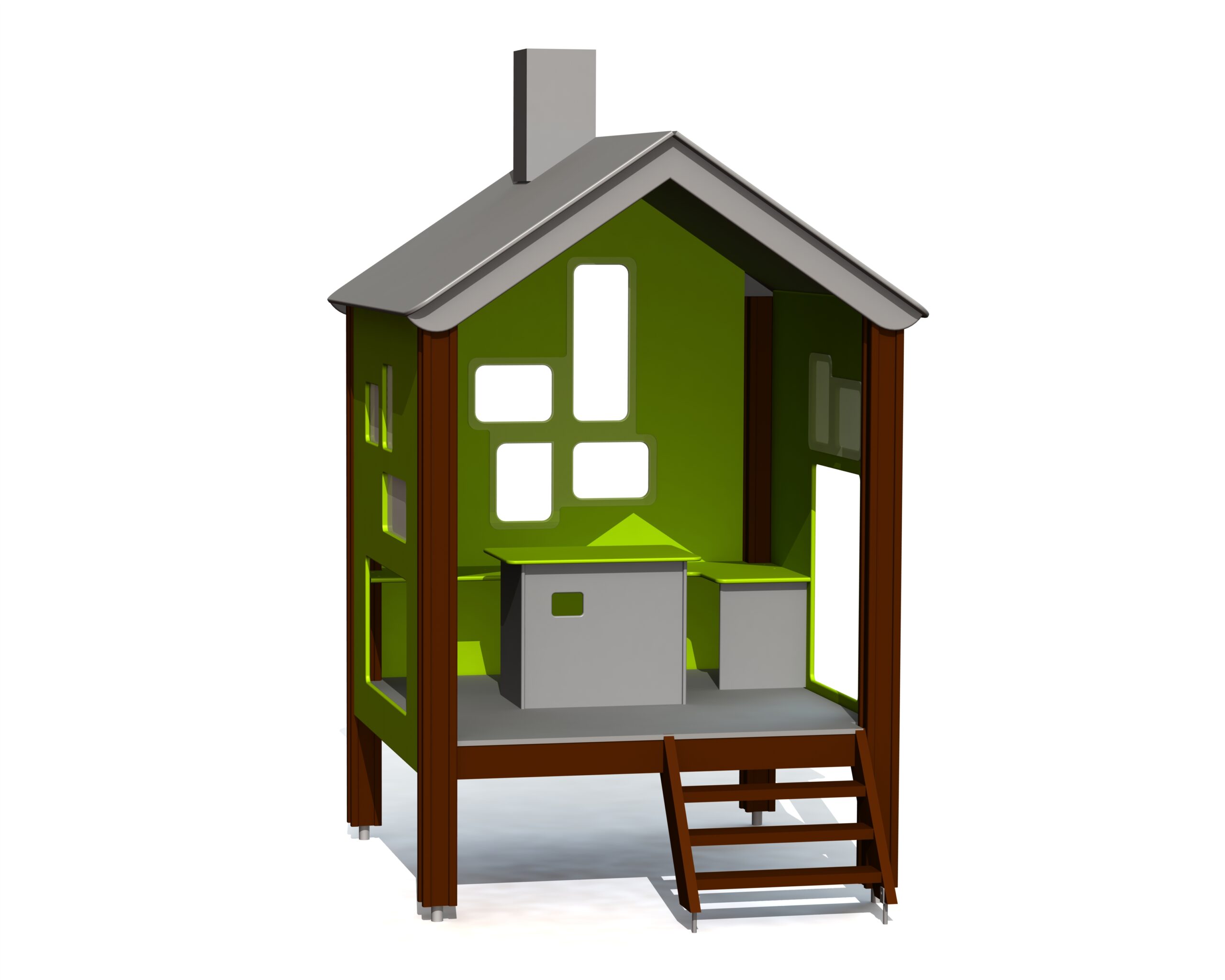 En mysig lekstuga med fönster, bänkar, lekbord och öppen dörrplats. Du kan gå in i lekstugan via trappor och genom att krypa genom väggöppningar.