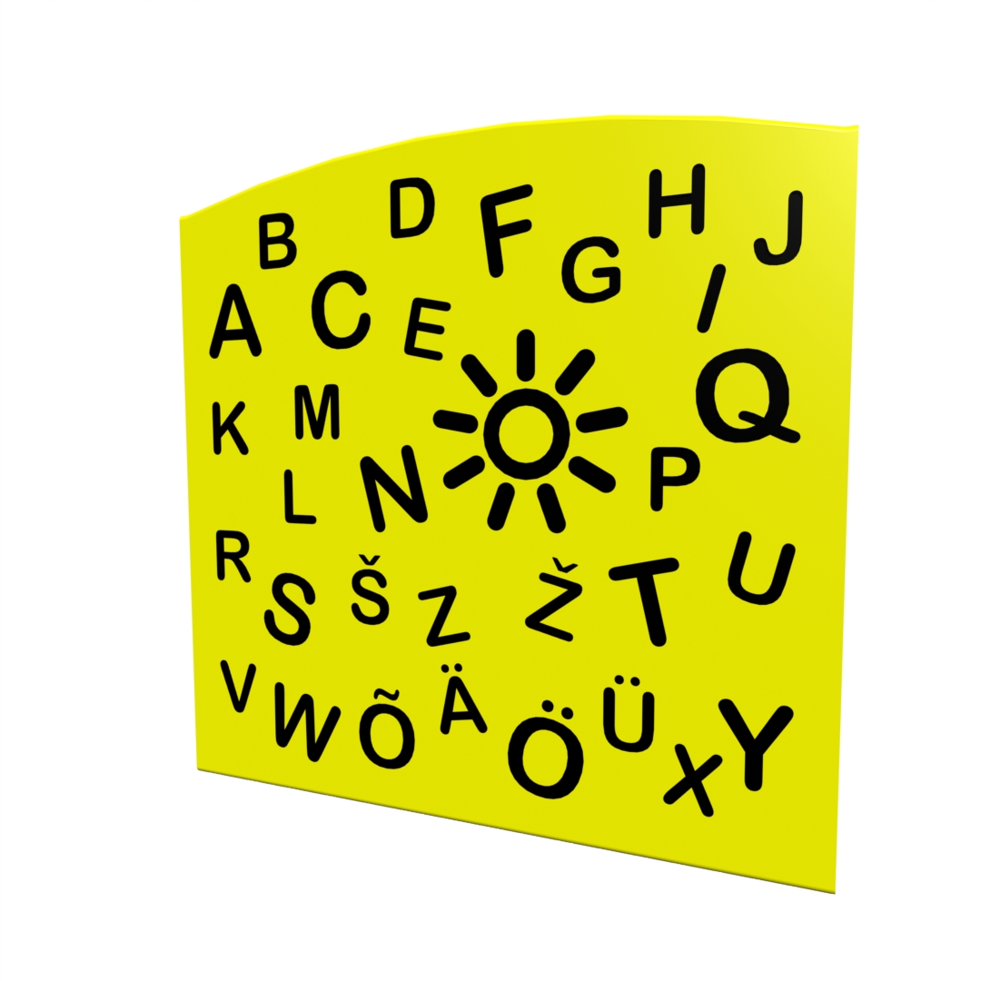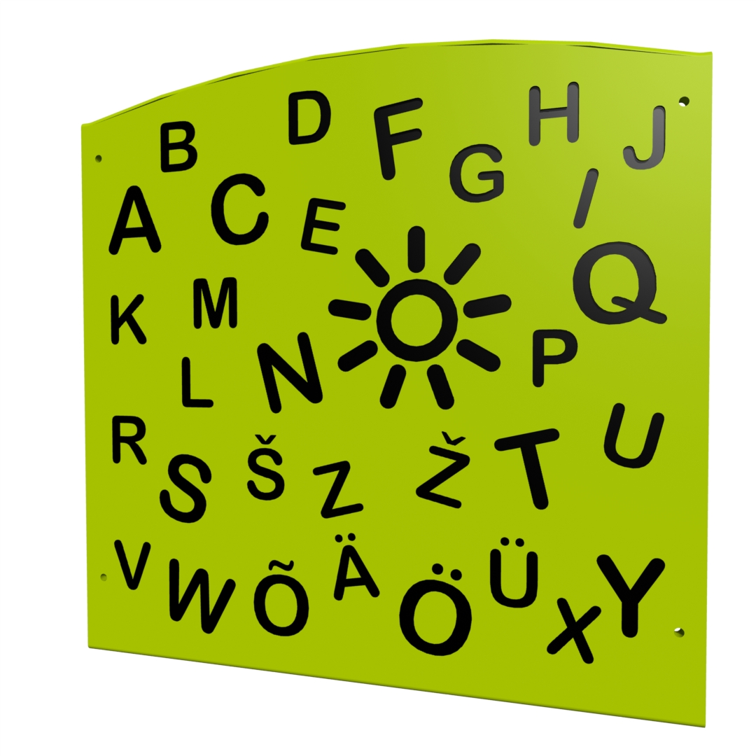 Aktivitetspanelen ALFABETET kan ersätta en vanlig panel vid beställning av ny lekutrustning eller monteras på befintliga lekredskap för att fräscha upp lekmiljön. Panelen är ett pedagogiskt verktyg för att träna bokstäver och språkutveckling.