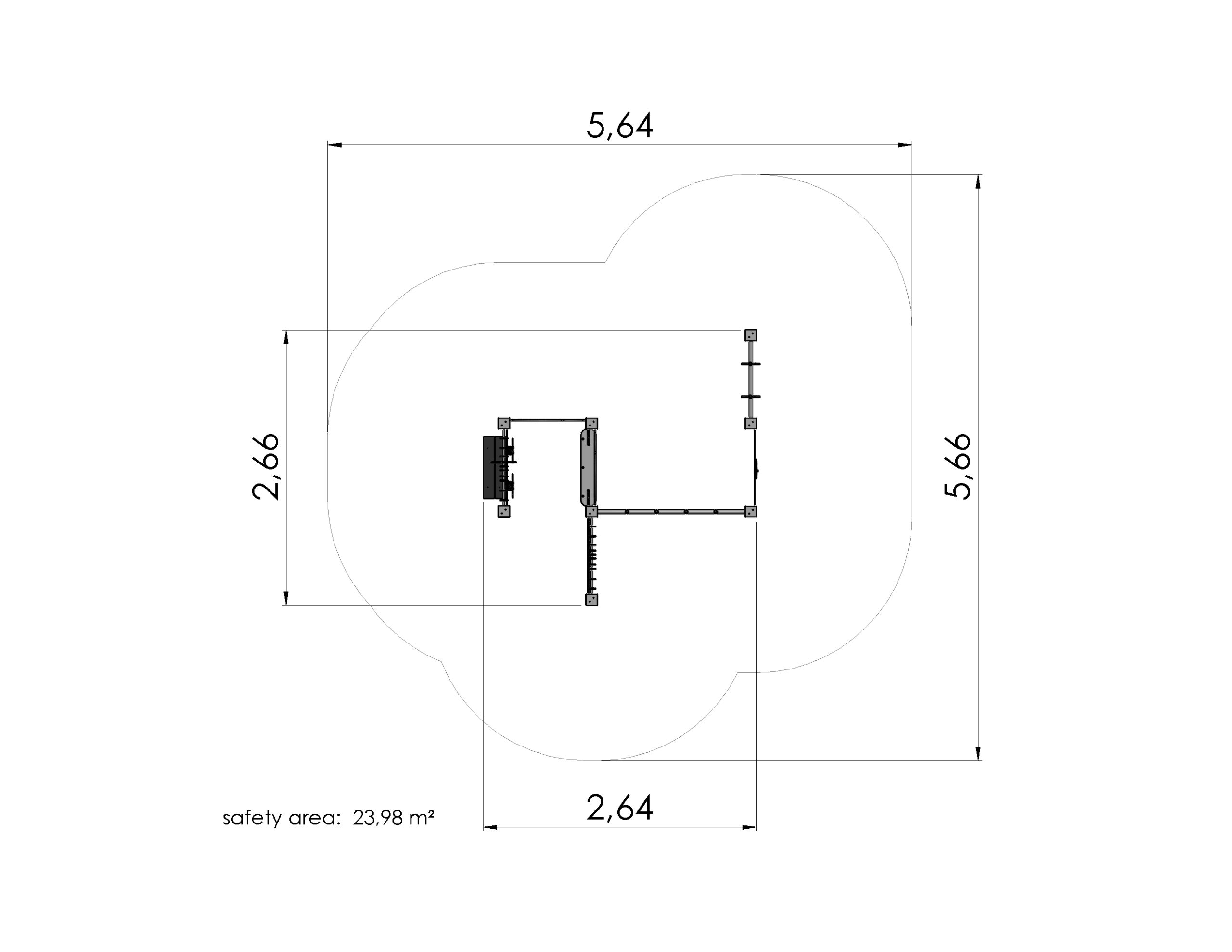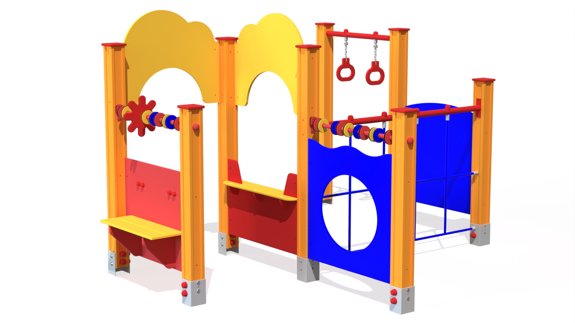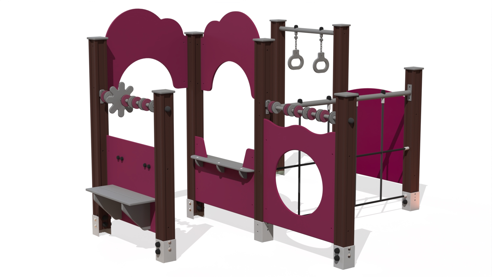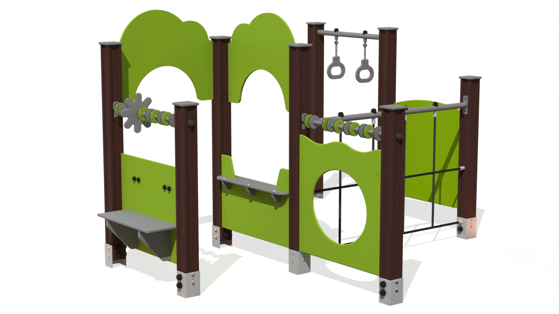Aktivitetsvägg bestående av flera paneler såsom Flygblad, panel med kryphål, klätternät, två diskar och två roterande rattar. Konstruktionen kompletteras med sittbänk, liten försäljningsdisk och hängande ringar, vilket skapar en varierad lekmiljö för rörelse, rollekslek och motorisk utveckling.