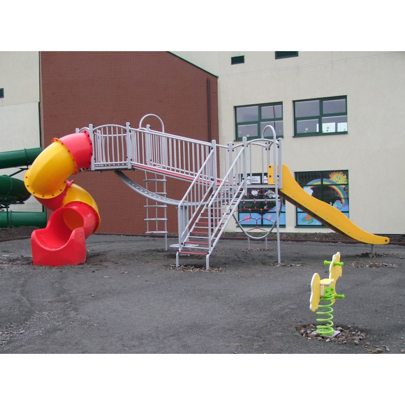 Multifunktionellt klätterset med två torn baserat på stödram fäst vid extremt stark grundpelare. Konstruktionen är varmförzinkad och pulverlackerad samt tillverkad av rör med rundad profil. Plattformarnas golv är täckta av PE-plåt med halkskydd. Setet är utrustat med polypropenrep 16 mm förstärkta med stålkärna. Glidytan är tillverkad av rostfritt stål och rutschkanans sidor av HDPE-material med 19 mm tjocklek. Plastslid kan vid behov fixeras.