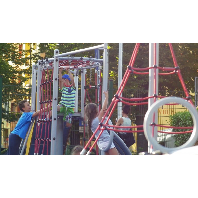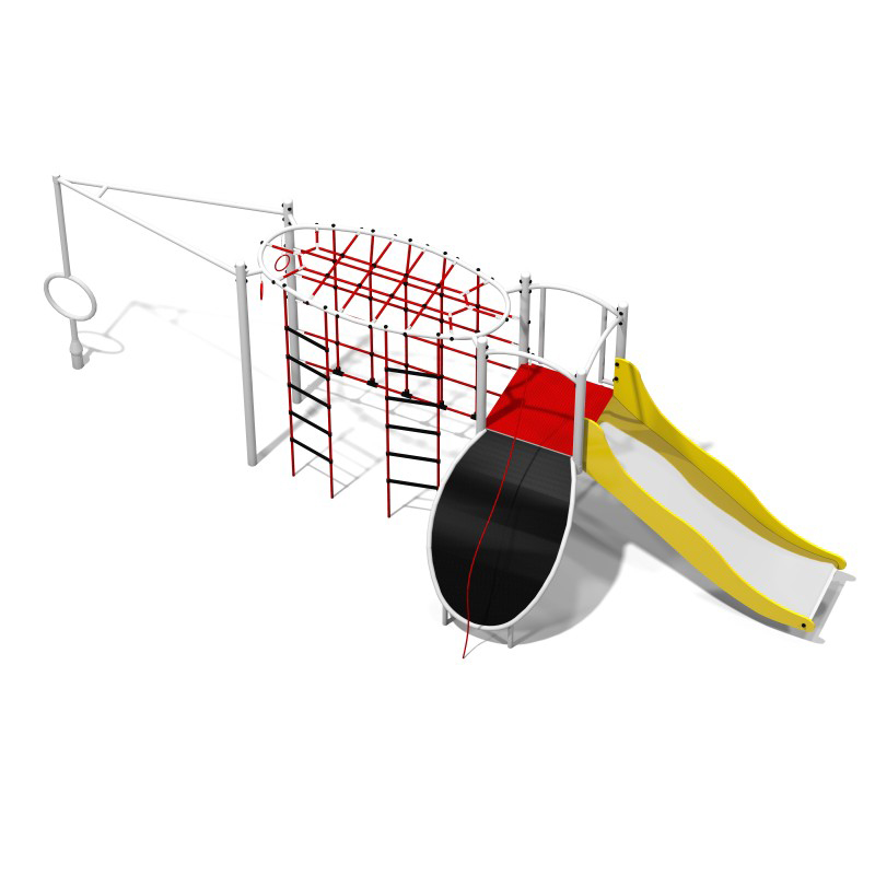 Ett-torns multifunktionellt klätterset baserat på extremt starka grundpelare. Konstruktionen är varmförzinkad och pulverlackerad samt tillverkad av rör med rundad profil. Plattformens golv är täckt av PE-plåt med halkskydd. Setet är utrustat med polypropenrep 16 mm förstärkta med stålkärna. Glidytan är tillverkad av rostfritt stål och rutschkanans sidor av HDPE-material med 19 mm tjocklek. Plastslid kan vid behov fixeras.