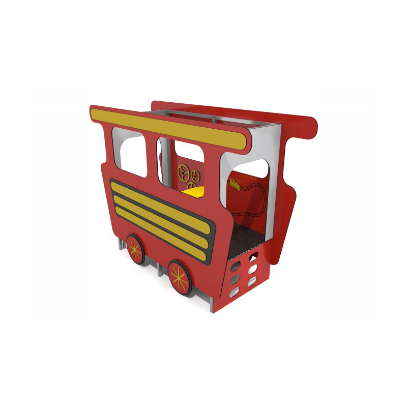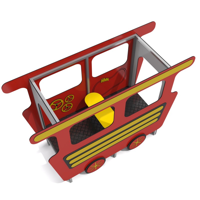 Lekplats som ser ut som en järnvägsvagn. Konstruktionen är tillverkad av galvaniserat och pulverlackerat stål. Väggarna består av HPL-skiva och dekorativa element av HDPE. Golvet är gjort av halksäker HPL-plåt.