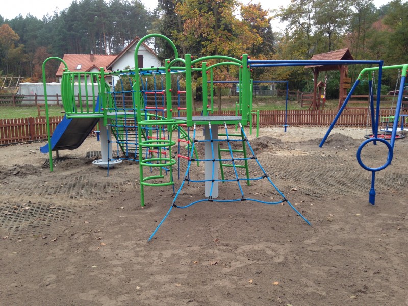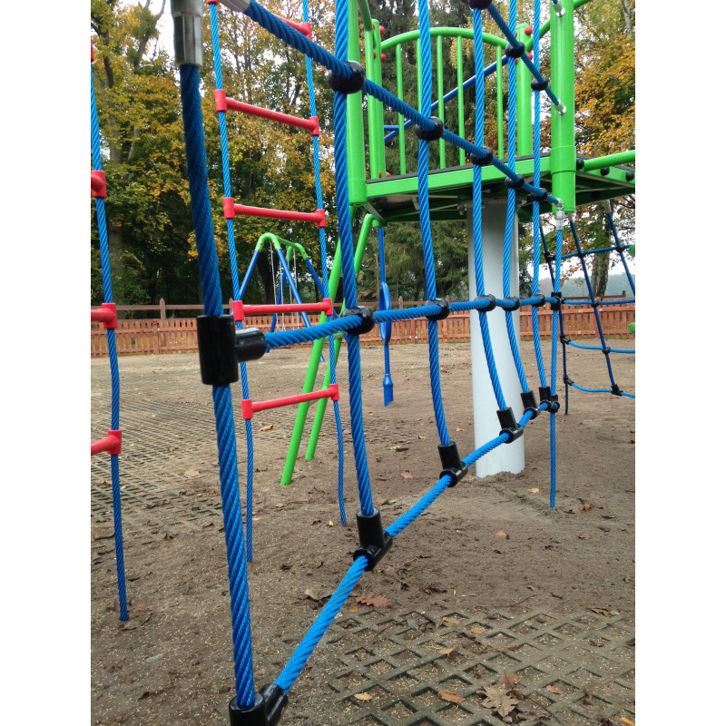 Multifunktionellt klätterset med två torn baserat på två extremt starka grundpelare. Konstruktionen är varmförzinkad och pulverlackerad samt tillverkad av rör med rundad profil. Plattformarnas golv är täckta av PE-plåt med halkskydd. Setet är utrustat med polypropenrep 16 mm förstärkta med stålkärna. Glidytan är tillverkad av rostfritt stål och rutschkanans sidor av HDPE-material med 19 mm tjocklek. Plastslid kan vid behov fixeras.