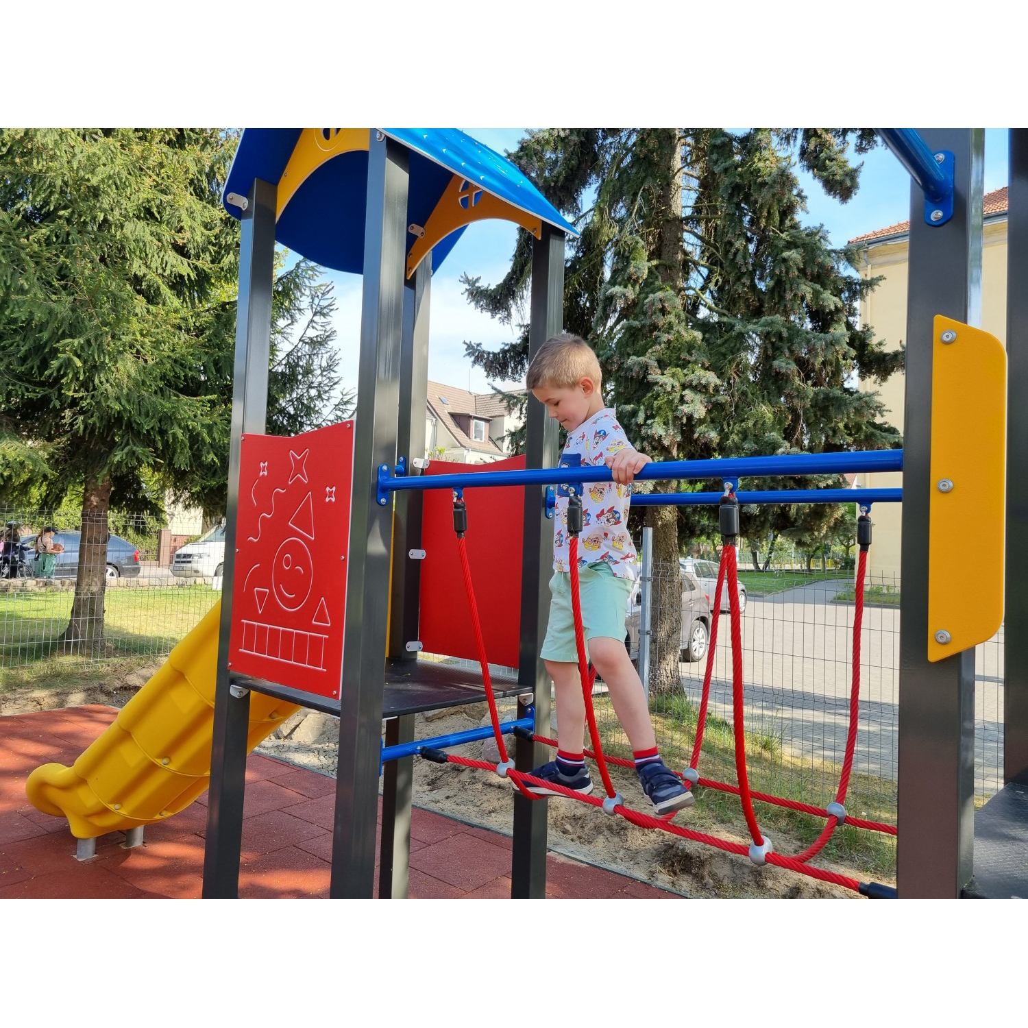 Konstruktion consistsrör med en square profil. Plattform Gjord av HPL material. Walls Gjord av HDPE material med en tjocklek 1 2 mm. A slide is Gjord av colorful, hållbart PE material that does not heat up. Nuts och washers are Gjord av rostfritt stål. Rope bridge Gjord av 1 6 mm polypropylene rope med en stål core.