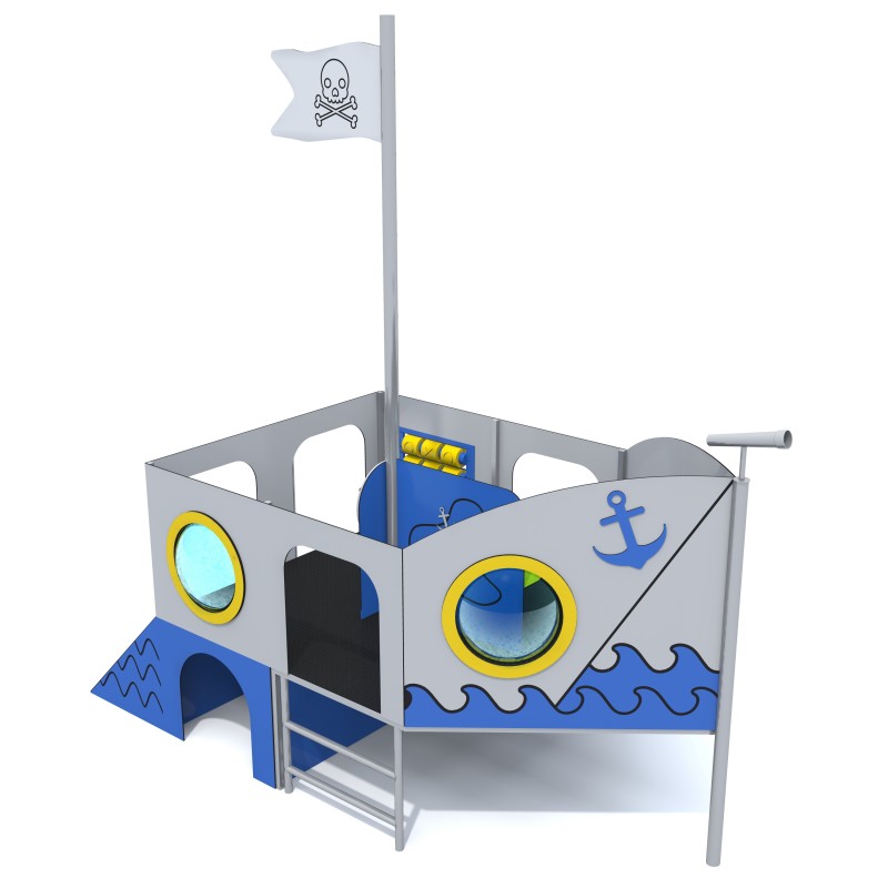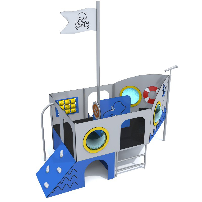 Lekplats utformad som ett skepp. Stommen är av galvaniserat och pulverlackerat stål. Väggarna är tillverkade av HPL-skiva med dekorativa HDPE-detaljer. Plattformen är gjord av halksäker HPL-skiva för säker användning.