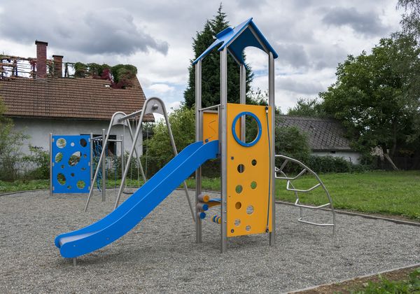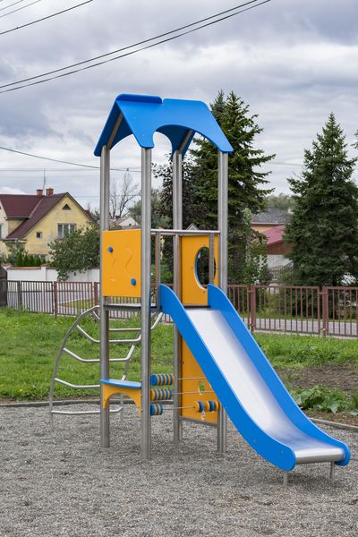 Mångsidigt lekset med rutschkana, klättermoment och interaktiva paneler som stimulerar både rörelse, lek och finmotorik.
