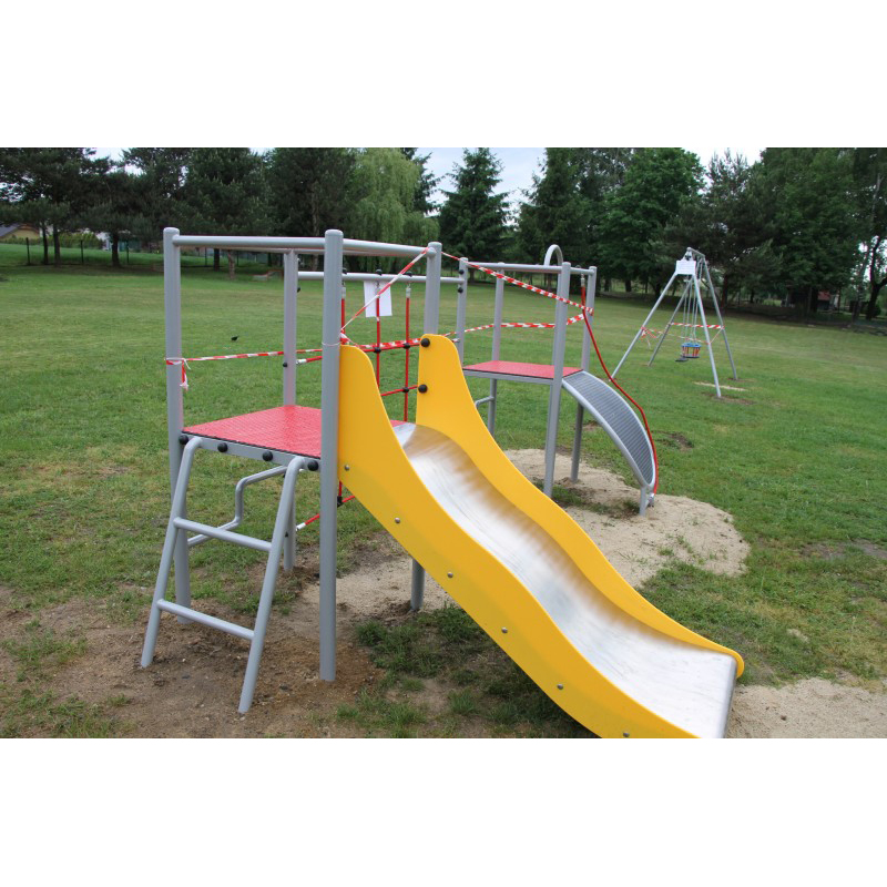 Multifunktionellt klätterset med två torn. Konstruktionen är galvaniserad och pulverlackerad med rundade rör. Plattformarna är täckta med halkskyddad PE-plåt och utrustningen inkluderar polypropenrep med stålkärna samt rutschkana i rostfritt stål. Anpassad för barn 3–15 år.