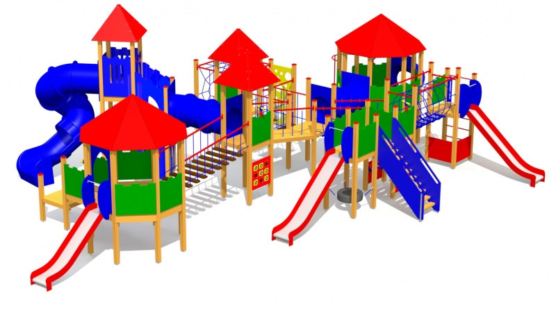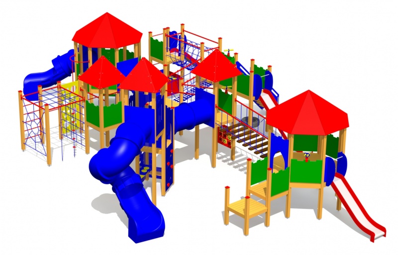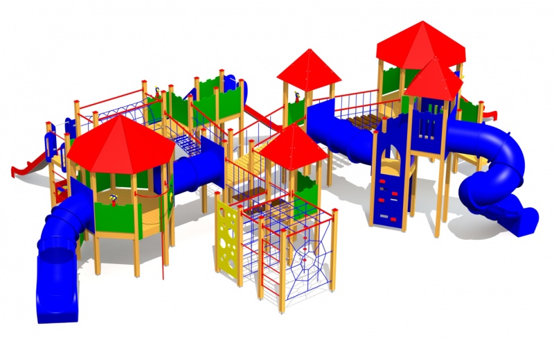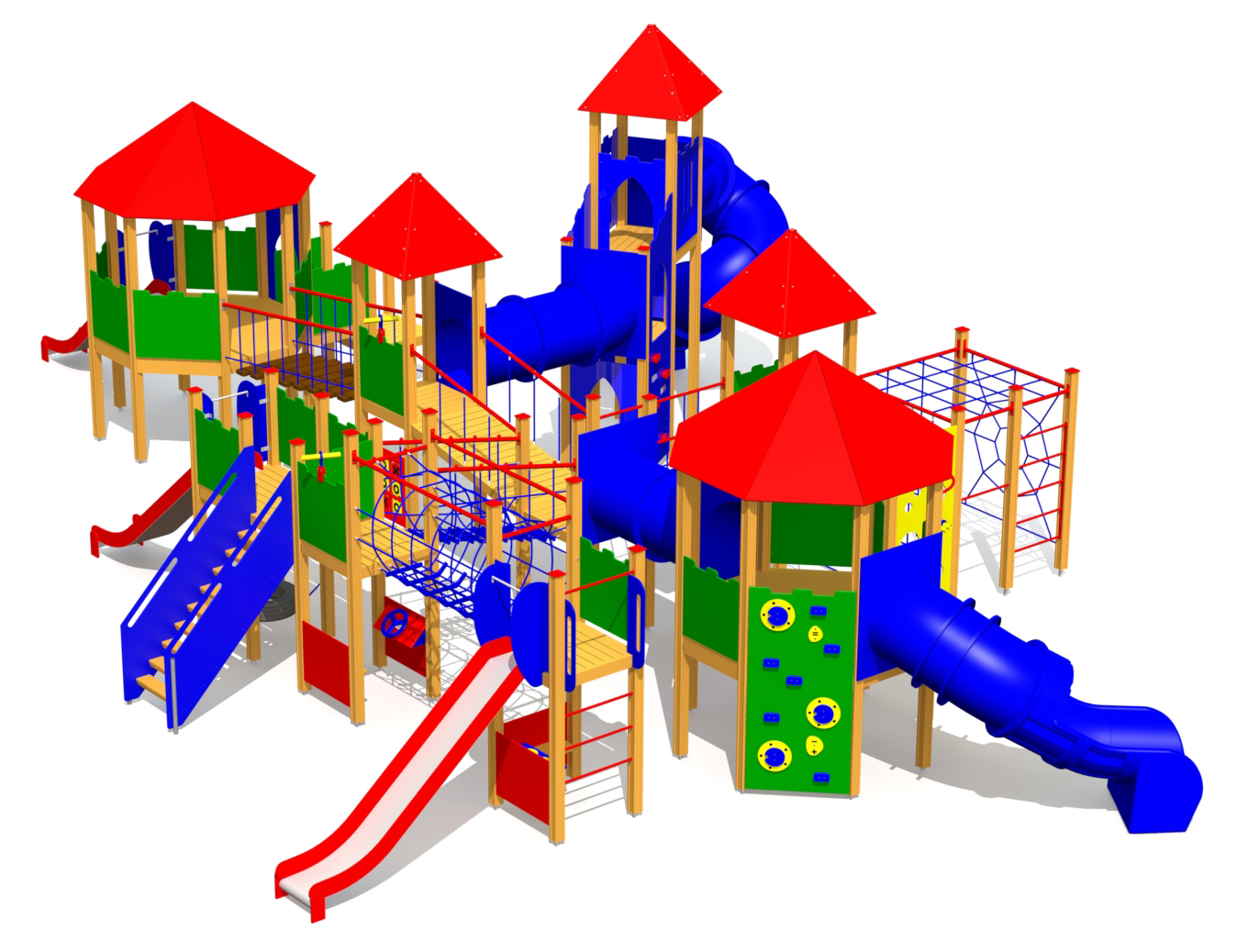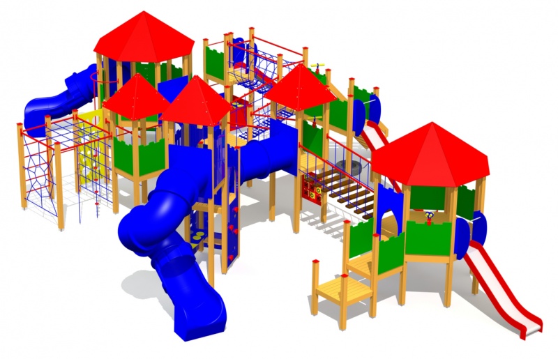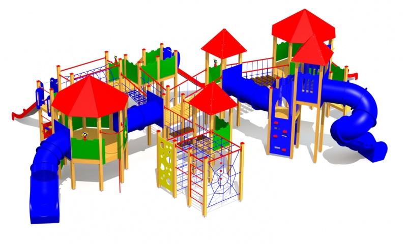 Mycket stor och variationsrik lekställning som erbjuder omfattande klättring, balanslek och fantasifullt samspel.