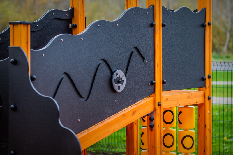 Ett lekcenter med tak, en liten rutschkana och en plattform med små trappor. En ramp med stegpinnar leder till den högre plattformen. De två plattformarna är förbundna med en sluttande bro. Ett kaptensroder, en kulram och ett Tic-Tac-Toe-spel erbjuder extra spelmöjligheter, ett leksaksfartyg kan seglas på en av sidopanelerna. Lekcentrets sidopaneler kan växlas till olika aktivitetsväggar eller tematiska tryckta paneler (djur, fåglar, fiskar, träd, bär, etc.). Utformningen av panelerna kommer att slutföras med kunden vid beställning.