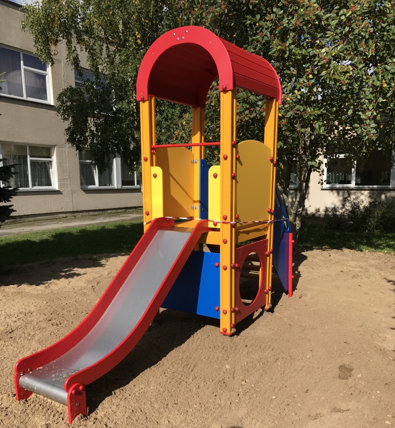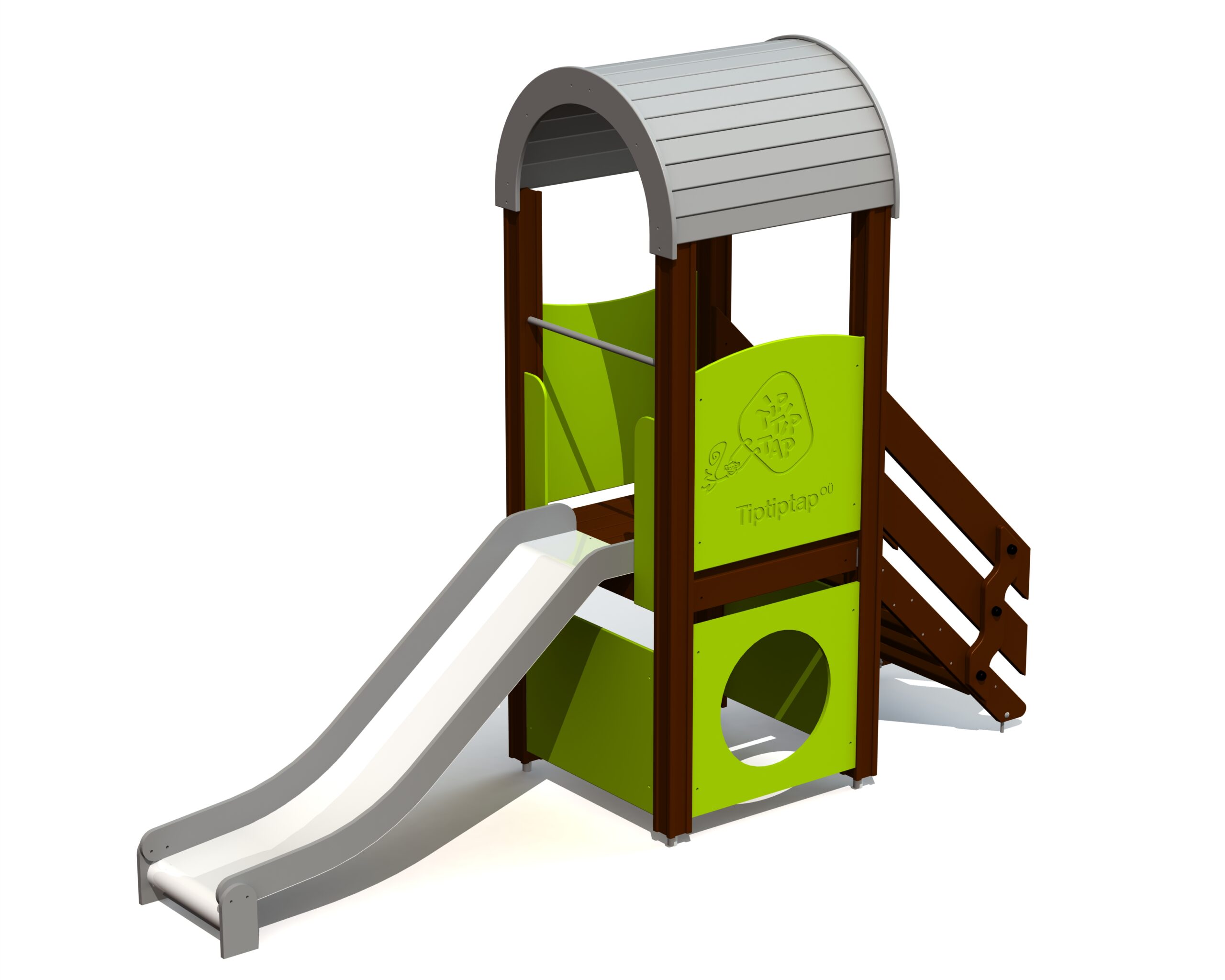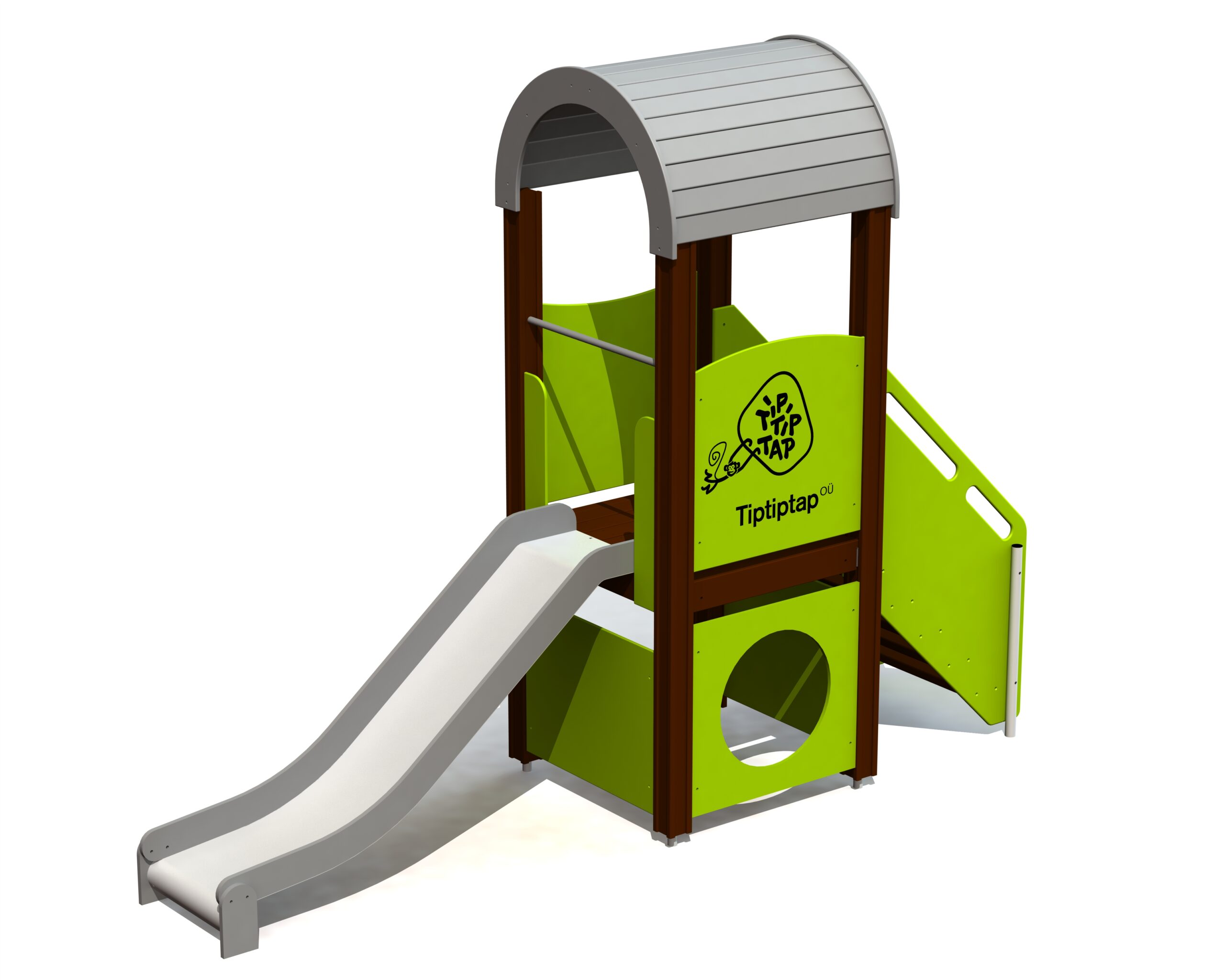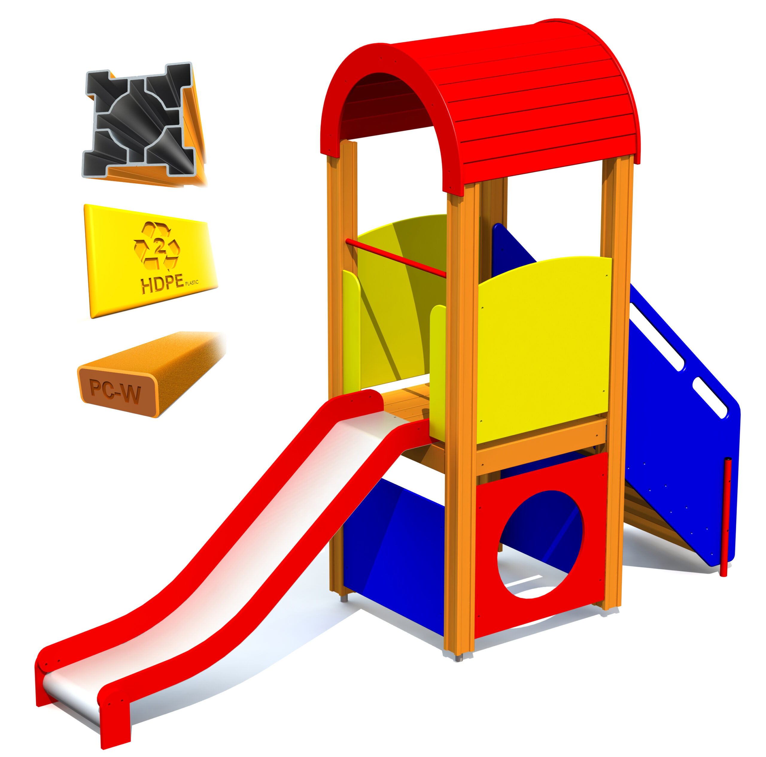 Trygg och färgglad lekställning för småbarn med rutschkana, tak och anpassningsbara aktivitetsväggar som stimulerar lek och motorik.