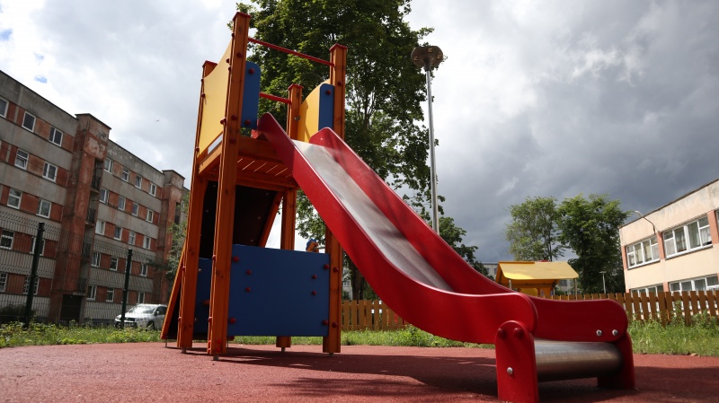 Mångsidig lekställning med rutschkana, ramp och pedagogiska lekpaneler som uppmuntrar både rörelselek och lärande för små barn.
