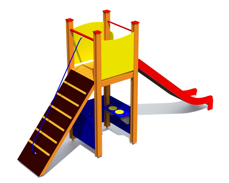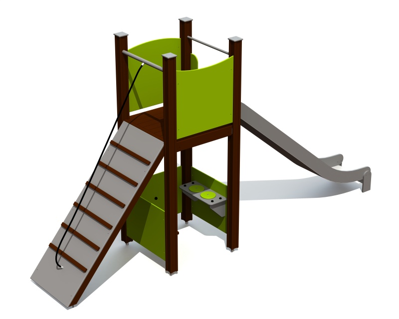 Lekställningen består av en rutschkana med ränna samt en ramp med stegpinnar som ger barnen flera sätt att ta sig upp. Under plattformen finns en lekhörna med bänk som kan kompletteras med antingen köks- eller bilinstrumentpanel för fantasifull rolllek. Utsidan är utrustad med en aktivitetspanel i form av en klocka som hjälper barnen att bekanta sig med tid. Sidopanelerna kan bytas ut mot olika aktivitetsväggar eller tematiska tryckta motiv såsom djur, fåglar, fiskar, träd eller bär. Utformningen av panelerna fastställs i samråd med kunden vid beställning.