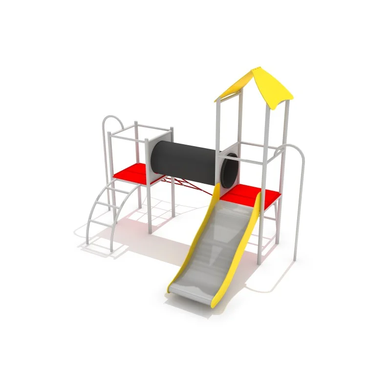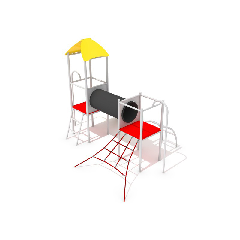 Multifunktionellt klätterset med två torn och en stabil konstruktion baserad på galvaniserade och pulverlackerade stålrör med rundad profil. Plattformarnas golv är täckta av PE-plåt med halkskydd för ökad säkerhet. Lekställningen är utrustad med polypropenrep på 16 mm förstärkta med stålkärna. Rutschkanans glidyta är tillverkad av rostfritt stål och sidorna av slitstarkt HDPE-material. Plastskivor kan väljas som tillval. Avsedd för barn i åldern 3–15 år.