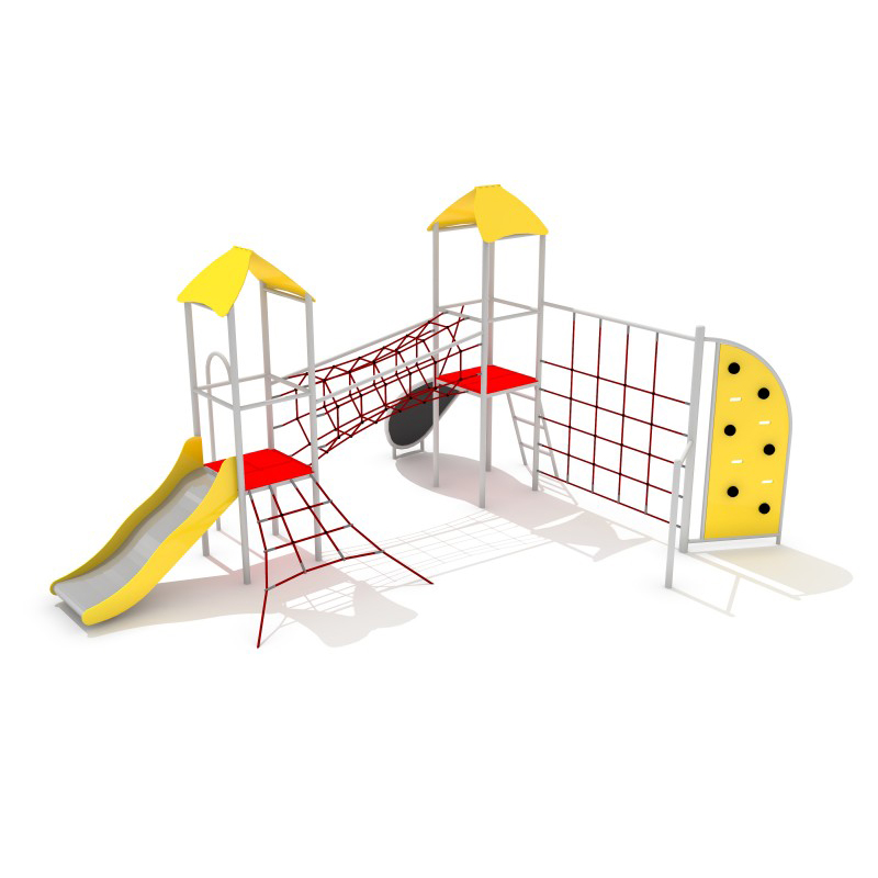 Multifunktionellt klätterset med två torn och en konstruktion av galvaniserade och pulverlackerade stålrör med rundad profil. Plattformarnas golv är täckta av PE-plåt med halkskydd. Setet är utrustat med polypropenrep på 16 mm förstärkta med stålkärna. Rutschkanan har glidyta i rostfritt stål och sidor av HDPE-material. Plastslid kan väljas som tillval. Avsedd för barn i åldern 3–15 år.