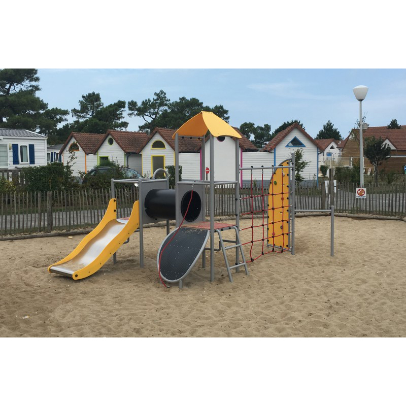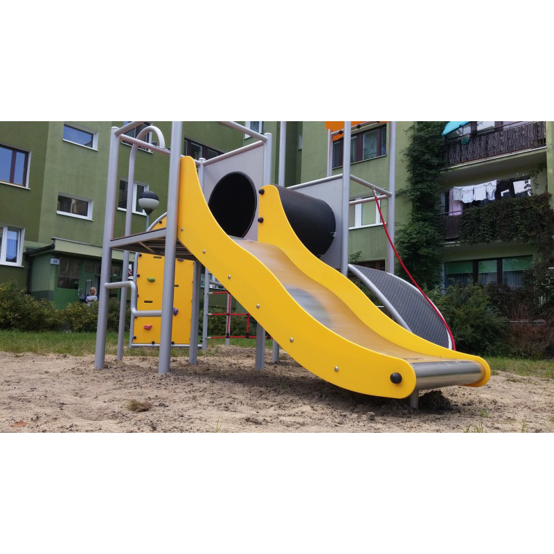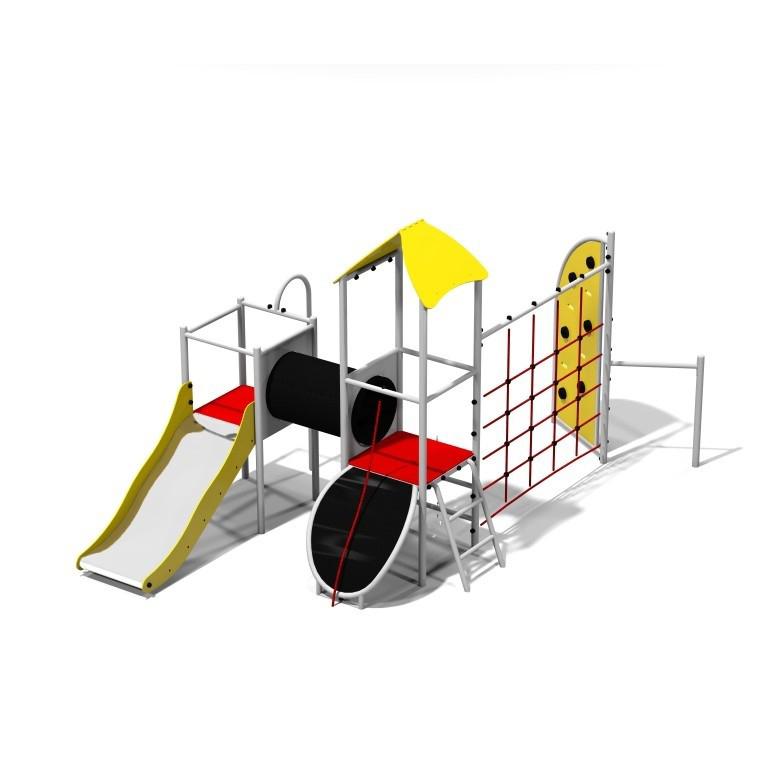 Multifunktionellt klätterset med två torn. Konstruktionen är galvaniserad och pulverlackerad samt uppbyggd av stålrör med rundad profil för hög hållbarhet och säkerhet. Plattformarnas golv är täckta av PE-plåt med halkskyddsprickar. Lekställningen är utrustad med polypropenrep på 16 mm förstärkta med stålkärna. Rutschkanans glidyta är tillverkad av rostfritt stål och sidorna av slitstarkt HDPE-material. Plastslid kan väljas som tillval.