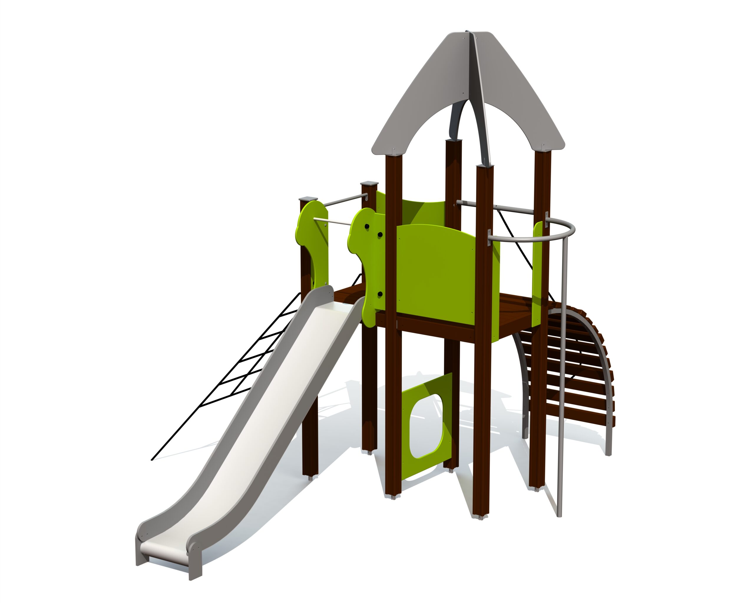 Lekställning med två plattformar som nås via välvd stig eller nätsluttning. Från brandmansstången finns en rutschkana som erbjuder ett roligt sätt att ta sig ner. Lekcentrets sidopaneler kan bytas till aktivitetsväggar eller tematiska motiv såsom djur, fåglar, fiskar, träd och bär. Utformning sker i samråd med kund vid beställning.