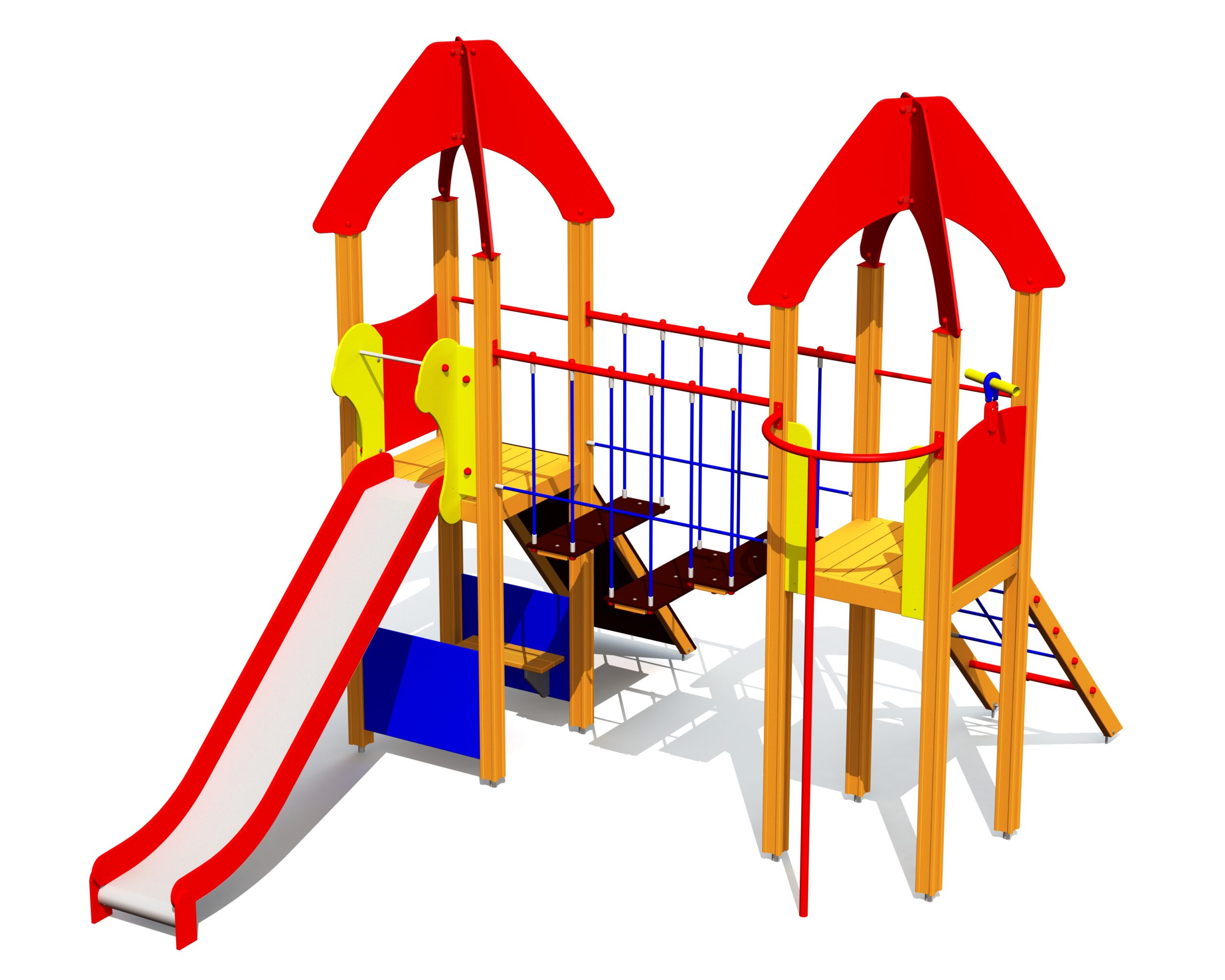 Motoriskt lekcenter med klättring, broar och rutschkana kombinerat med rolleksytor. Utformat för barn som vill röra sig, samarbeta och leka kreativt.