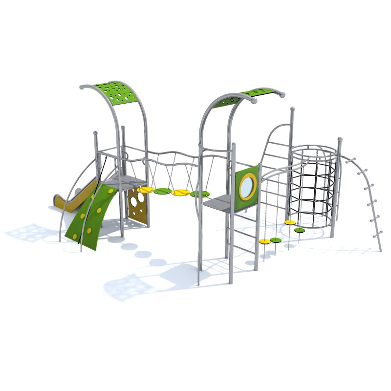 Konstruktion i rostfritt stål med rutschkana och dekorativa kulavslut. Golvet är tillverkat av halkfri HPL som ger hög säkerhet och komfort. Lekställningen är väderbeständig och anpassad för intensiv användning. Finns även i galvaniserad och pulverlackerad version.