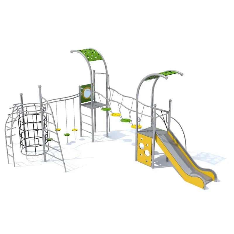 Konstruktion och slide Gjord av stainelss stål resistant to väderförhållanden och intensive use. Wheels, roofs, bridge, climbing vägg, sideslide och entrance ramp Gjord av HDPE material.