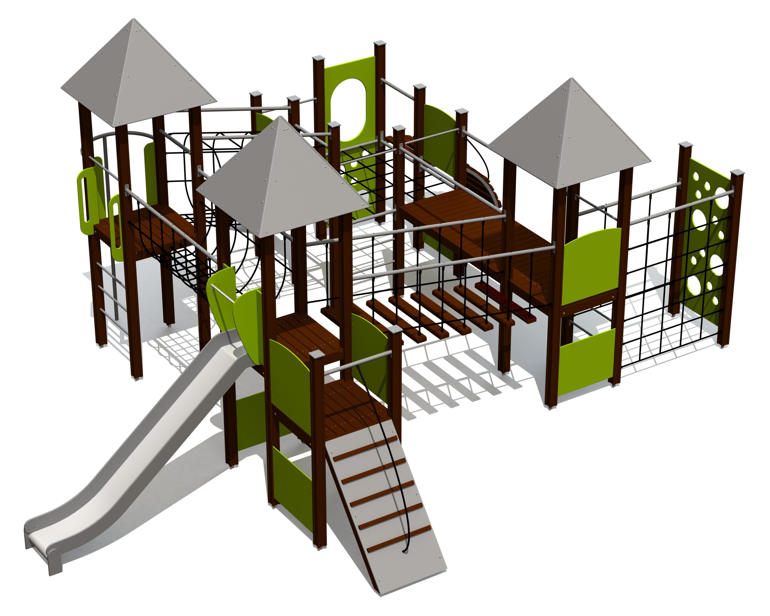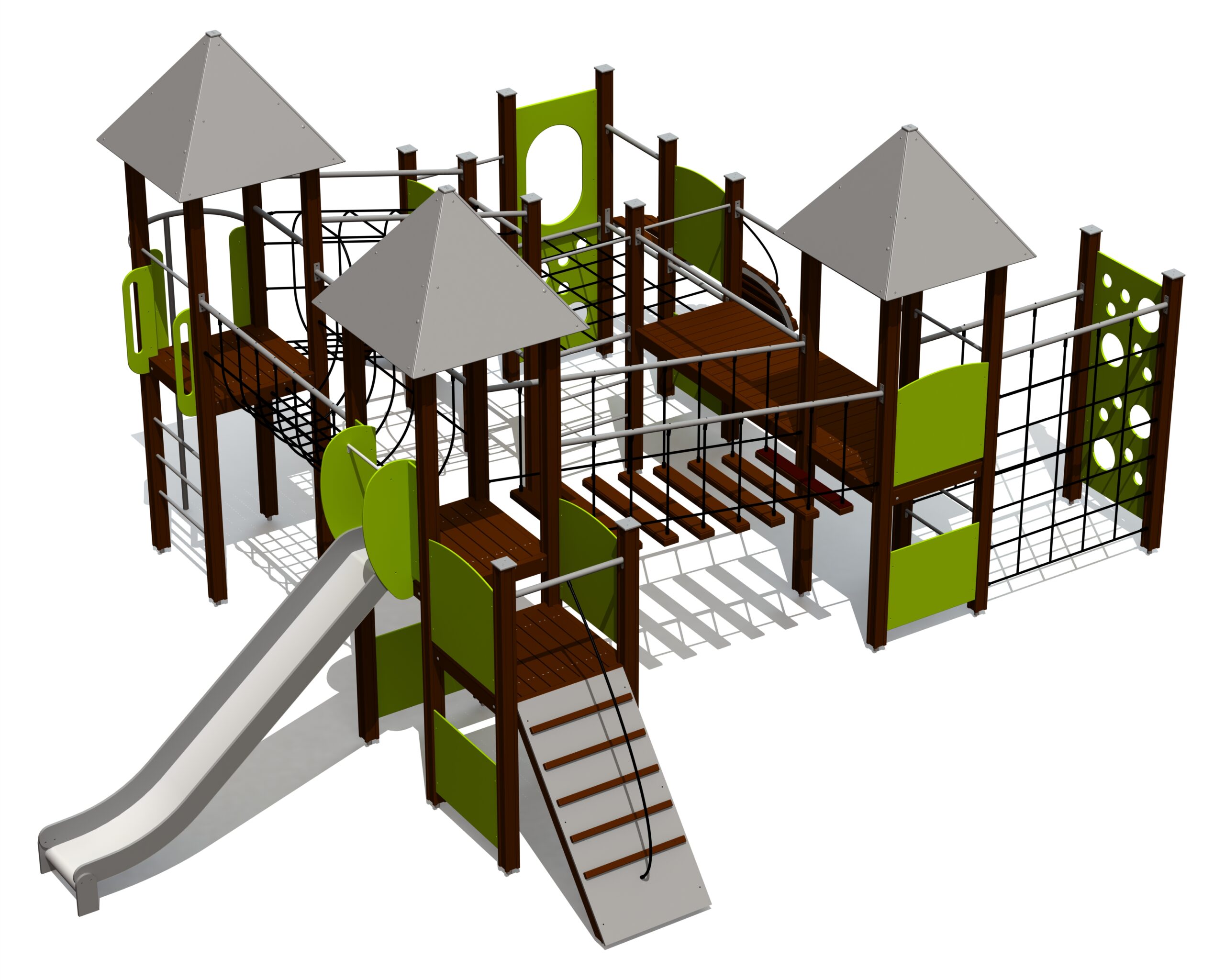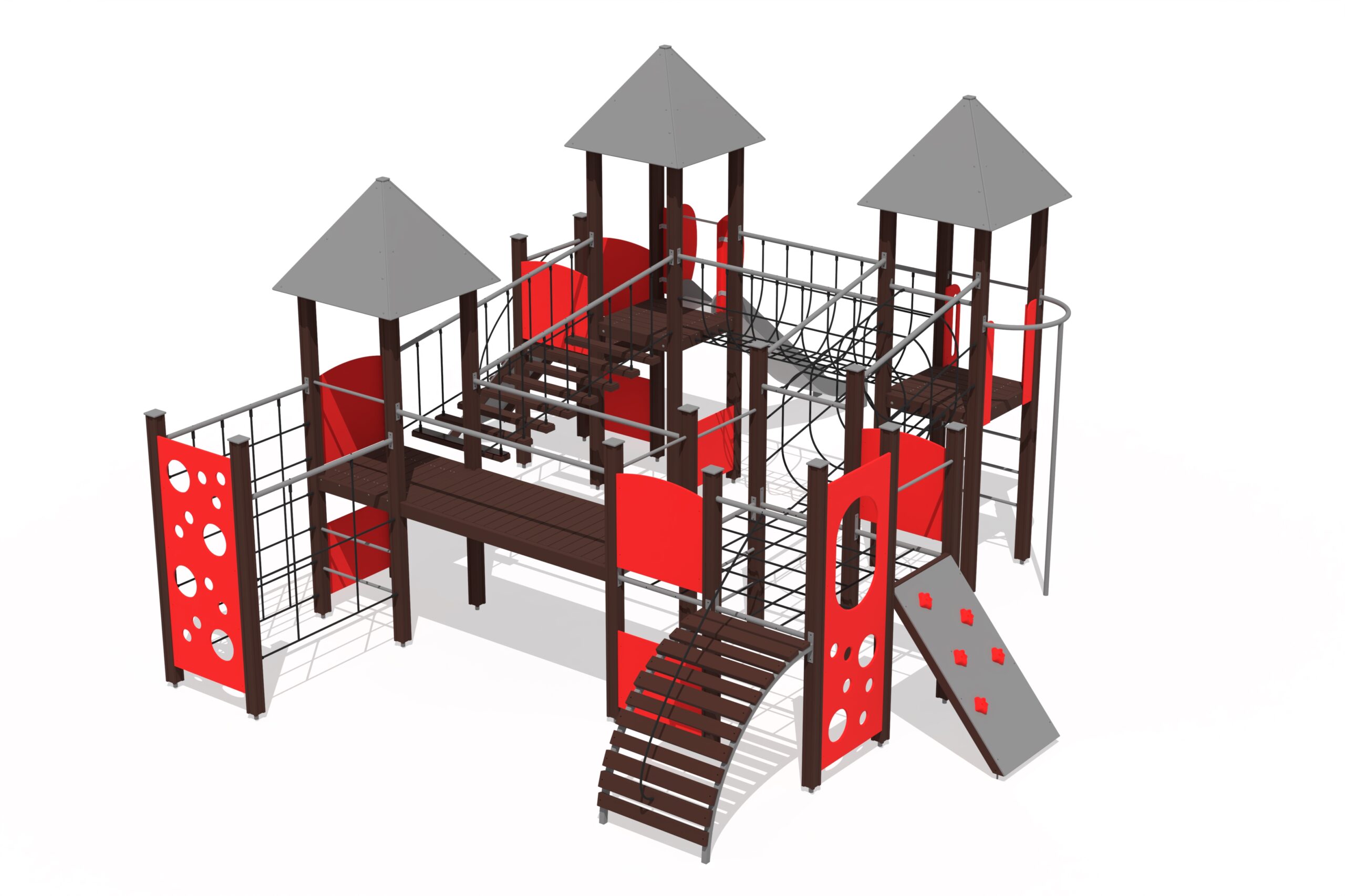 Detta mångsidiga lekcenter har fyra plattformar och flera sammanlänkande element som tränar balans, koordination och styrka. Lekcentret nås via ramp med stegpinnar, stege eller välvd stig med repstöd. Plattformarna binds samman av hängbro med rörliga steg, nätbro och nättunnel. Tre klätterväggar med varierande svårighetsgrad ger extra utmaning. En rutschkana eller brandmansstång ger fartfylld nedfärd. Sidopanelerna kan bytas mot aktivitetsväggar eller tematiska tryckta paneler, vars utformning fastställs tillsammans med kunden vid beställning.
