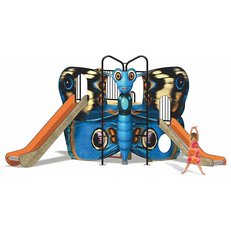 Fjärilsformad lekplats med två plattformar på 140 cm respektive 88 cm. Utrustningen innehåller två rutschkanor, klätterstänger, stege samt skydd med bänk. Tillverkad av UV-beständiga HPL-paneler, galvaniserade och pulverlackerade stålrör samt rutschkanor i rostfritt stål. Installation sker via ytmontering.