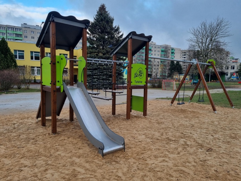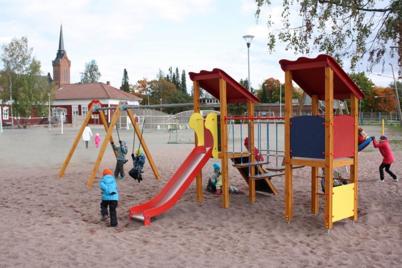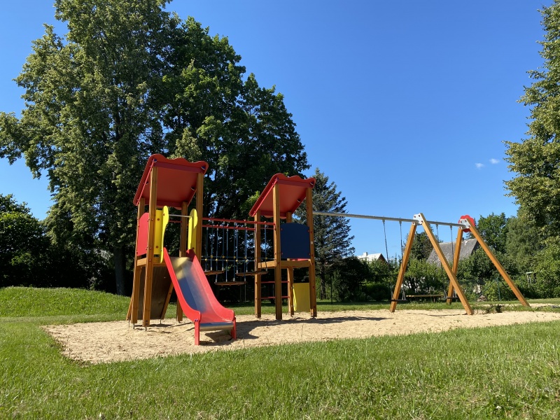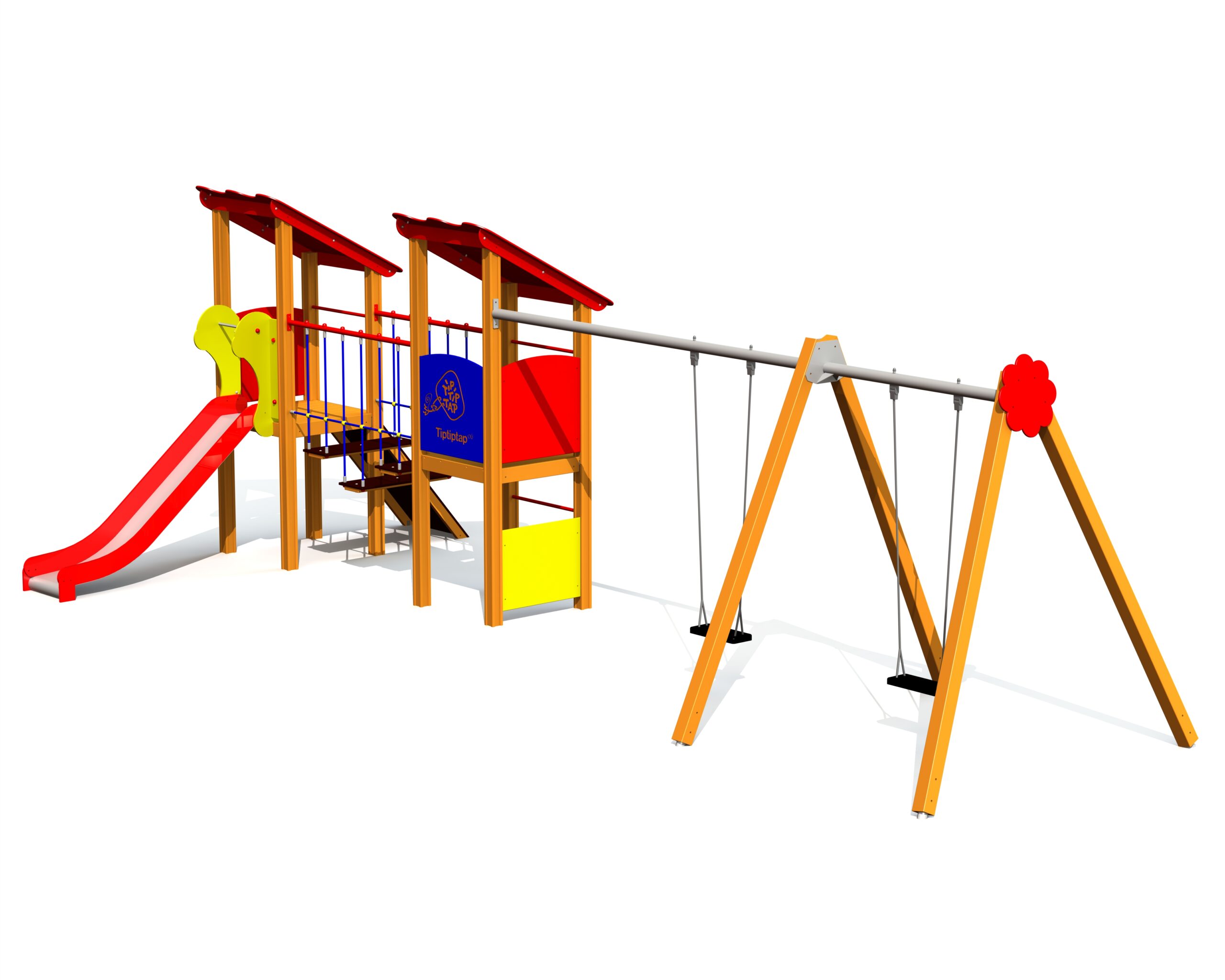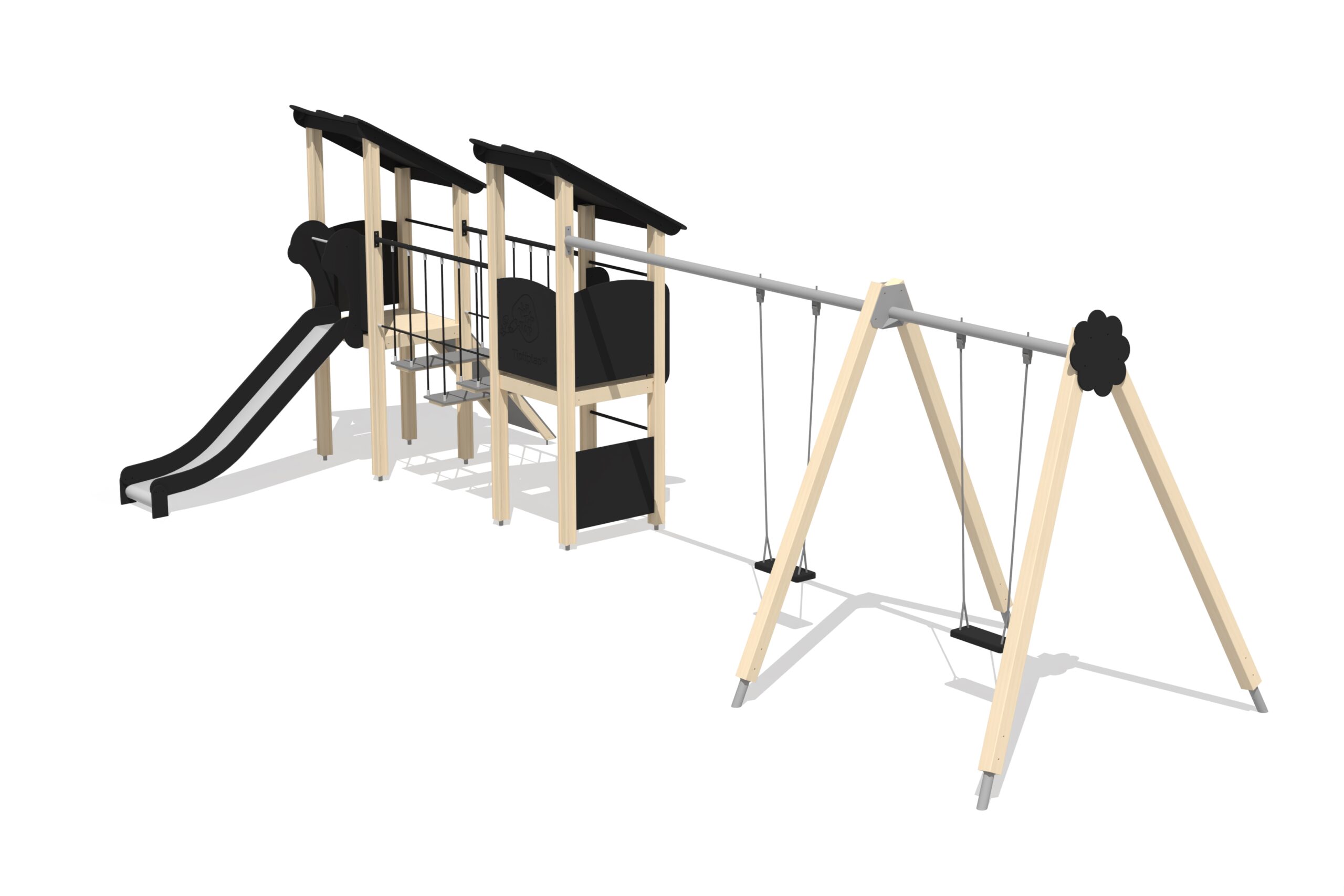 Kombinerad lekplats med rutschkana och gungor som erbjuder både aktiv rörelselek och balansutmaningar.