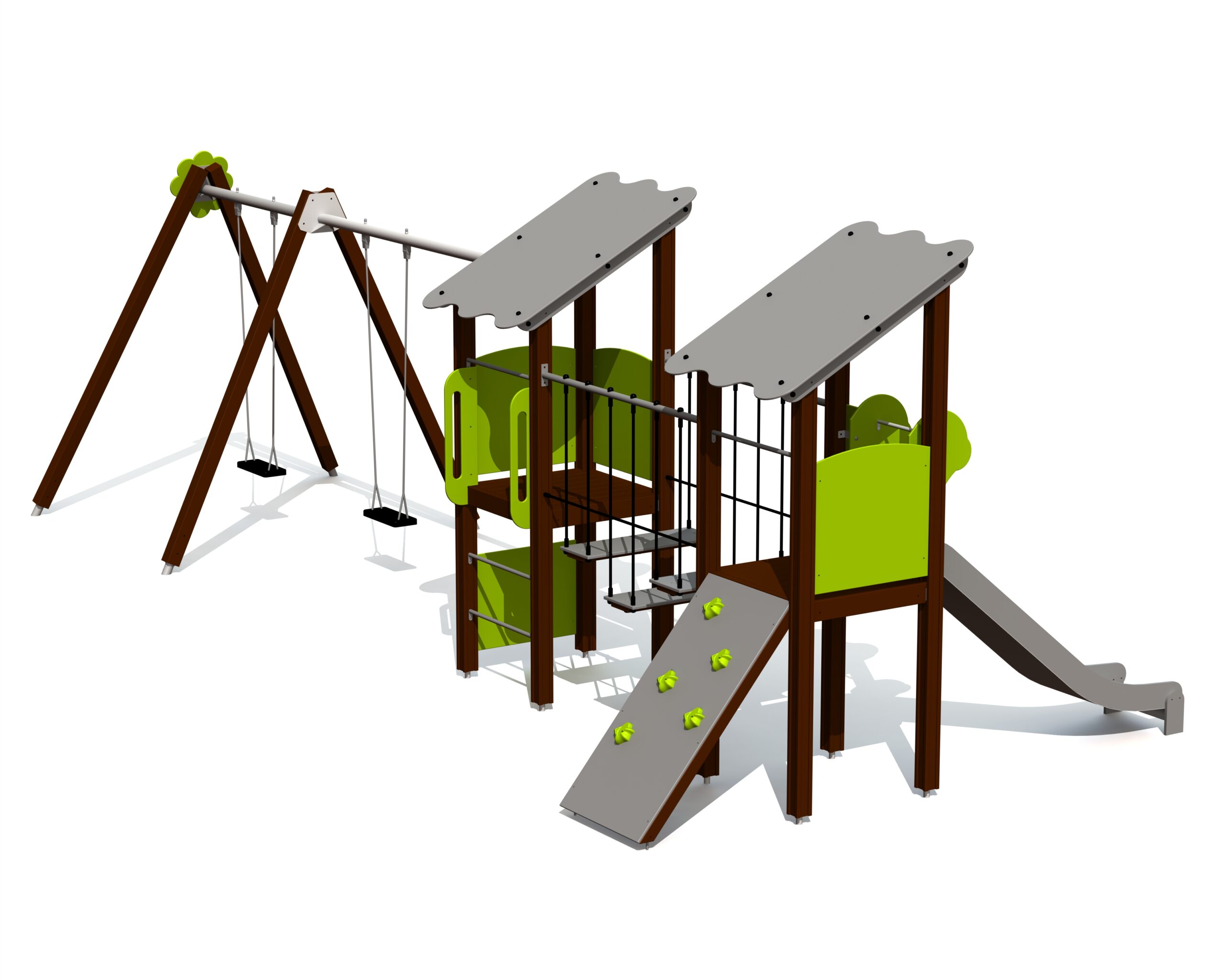 Mångsidig lekplats med takplattformar, rutschkana och två gungställningar. Tillgång ges via bergsklättringssluttning och stege. Plattformarna binds samman med balansbro med ledstänger. En kraftig metallbalk bär två aluminiumförstärkta gummigungsitsar, gungställning KRK2 ingår. Sidopaneler kan bytas mot aktivitets- eller temapaneler enligt kundens val.
