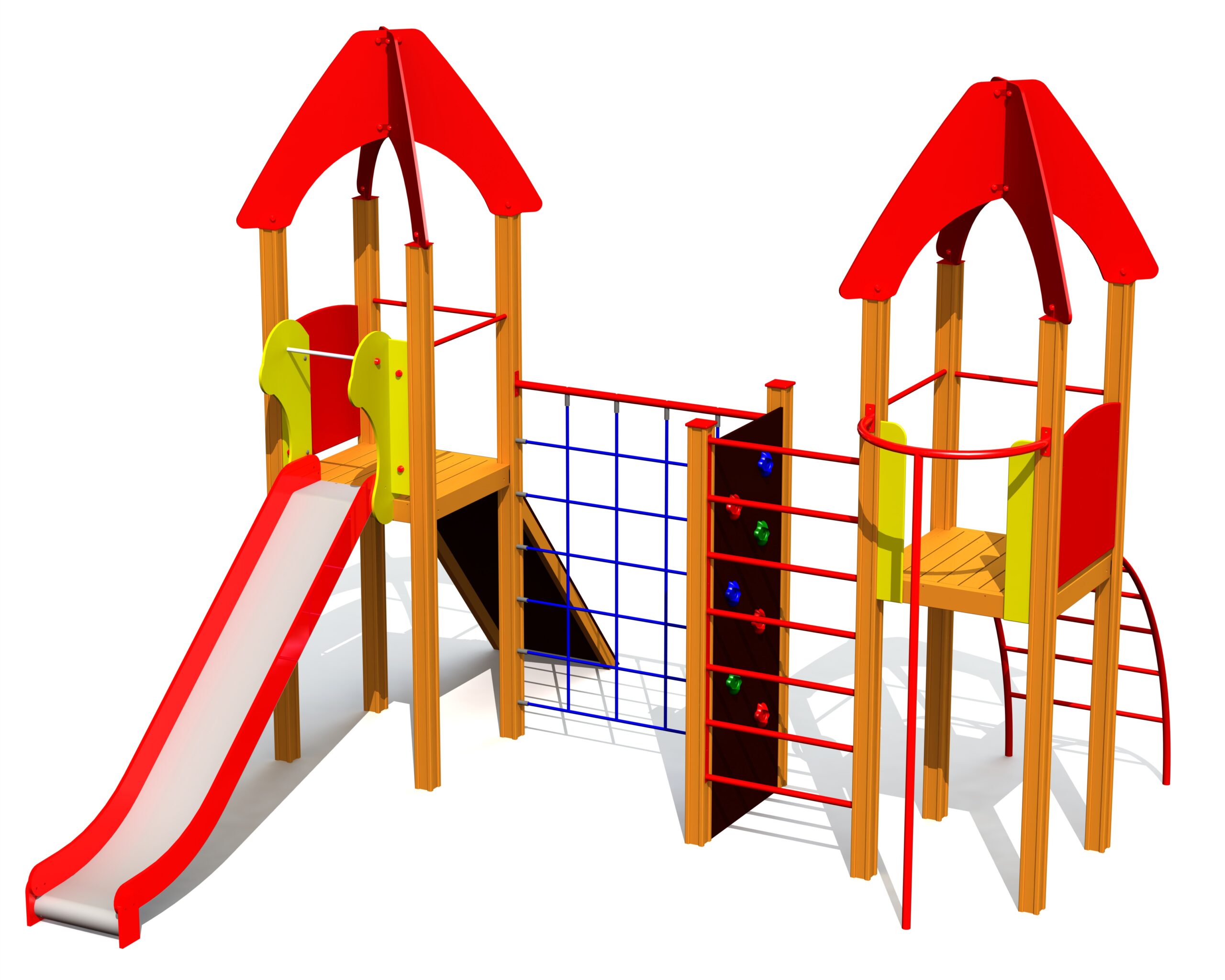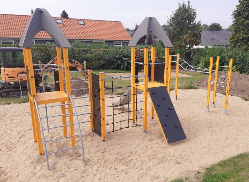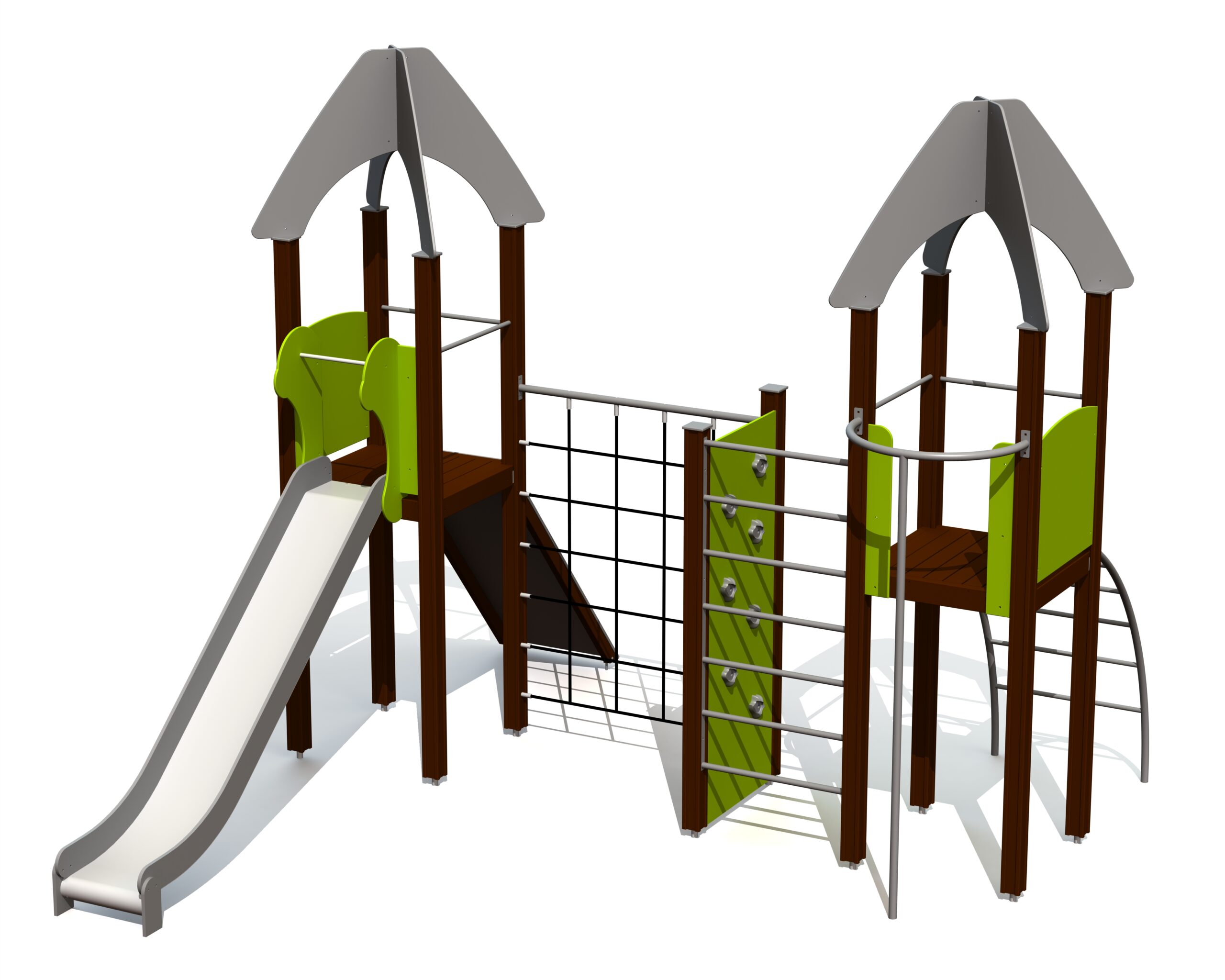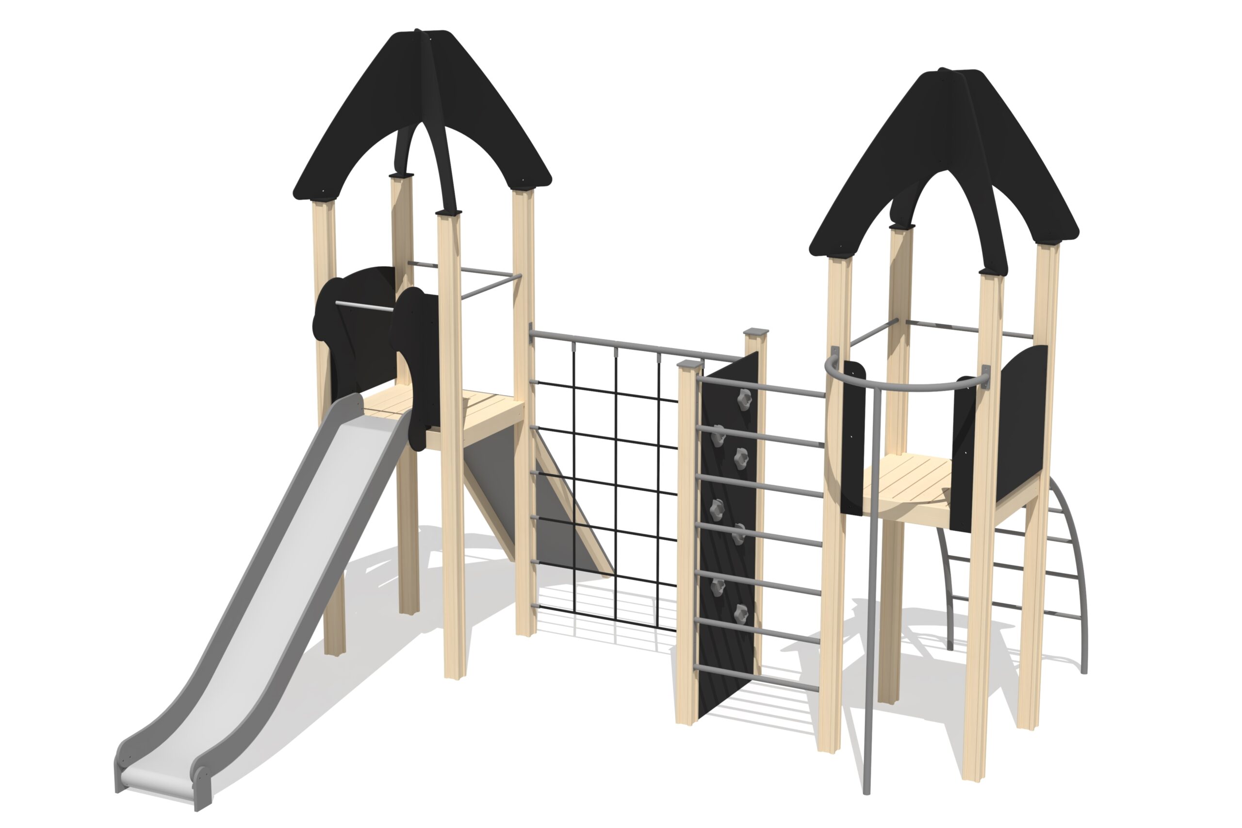 Lekställning med två plattformar som binds samman av nätklättervägg, vertikal stege och klättervägg. Plattformarna nås via bergsklättringssluttning eller välvd stege. En rutschkana och en brandmansstång ger roliga och snabba vägar ner. Lekcentrets sidopaneler kan bytas mot aktivitetspaneler eller tematiska motiv såsom djur, fåglar, fiskar, träd och bär. Utformning sker i samråd med kund vid beställning.