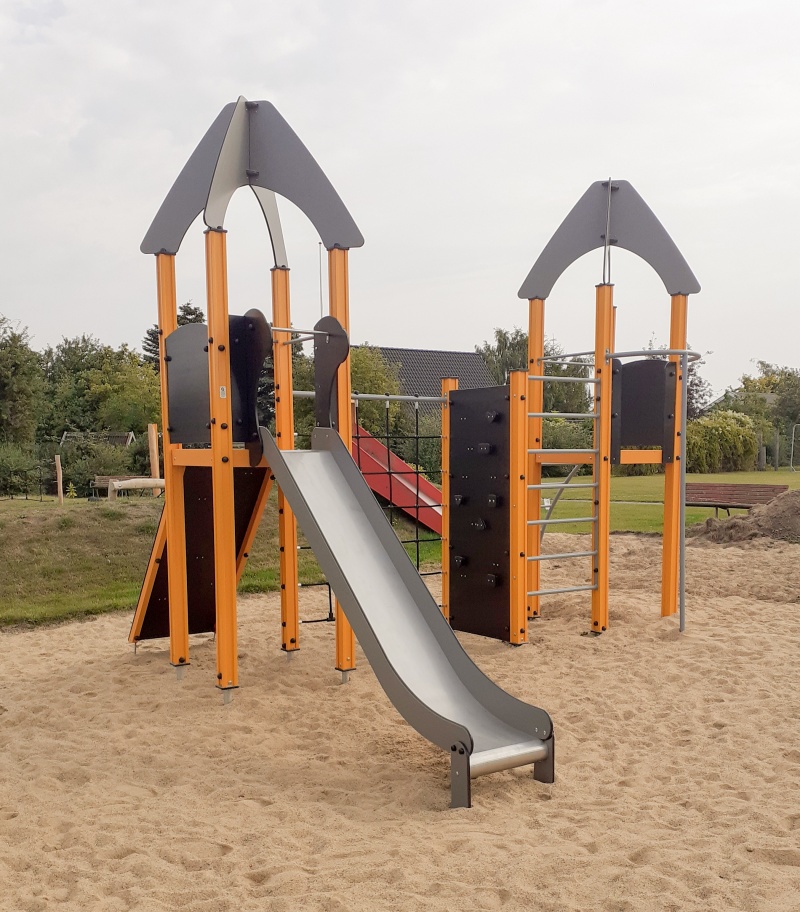 Mångsidig lekställning med två plattformar som kombinerar klättring, balans och fartfylld lek för barn som vill utmanas fysiskt och motoriskt.