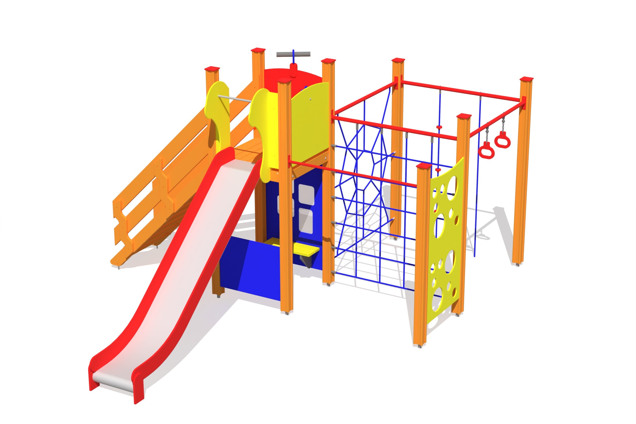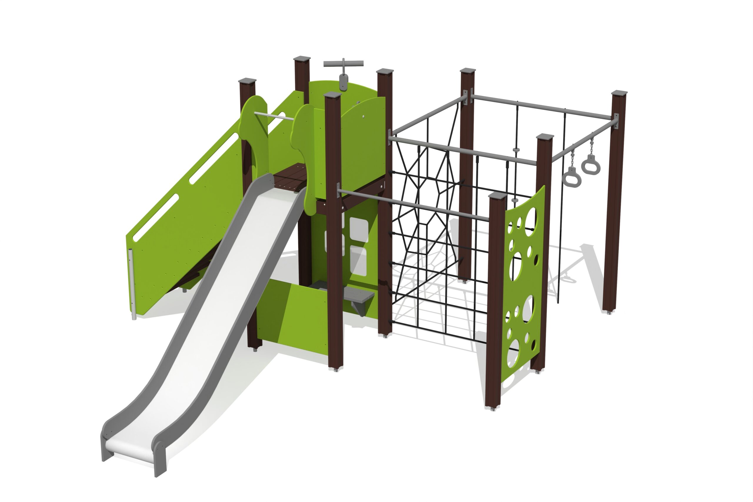 Produkten är utvecklad för lekplatser, förskolegårdar och andra offentliga utemiljöer där utrustningen behöver tåla regelbunden användning över tid. Modellen kombinerar flera lekmoment och ger barn möjlighet till varierad aktivitet, samspel och motorisk utveckling. Mått enligt specifikation: cirka 4,81 x 3,92 x 2,51 m. Rekommenderad ålder: 1+. En hållbar lösning för långsiktig drift och trygg användning i offentlig utemiljö.