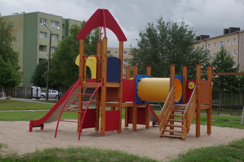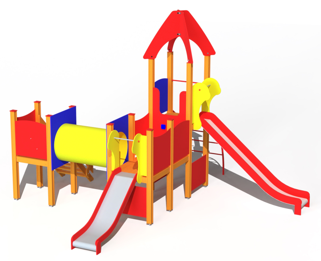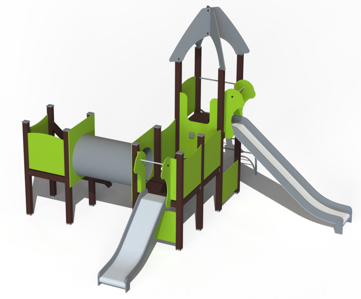 Lekcenter med fyra plattformar, tunnel och två rutschkanor. Trappor med ledstänger leder till den första plattformen med aktivitetspanel. En kryptunnel leder vidare till en plattform med klättervägg. En välvd stege tar barnen upp till plattformen med snedtak och ytterligare rutschkana. Sidopanelerna kan anpassas med aktivitets- eller tematiska paneler enligt kundens val.