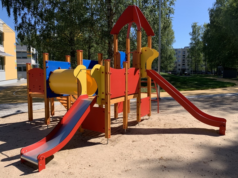 Stort och variationsrikt lekcenter med flera plattformar, tunnlar och rutschkanor som erbjuder utmanande och engagerande lek.