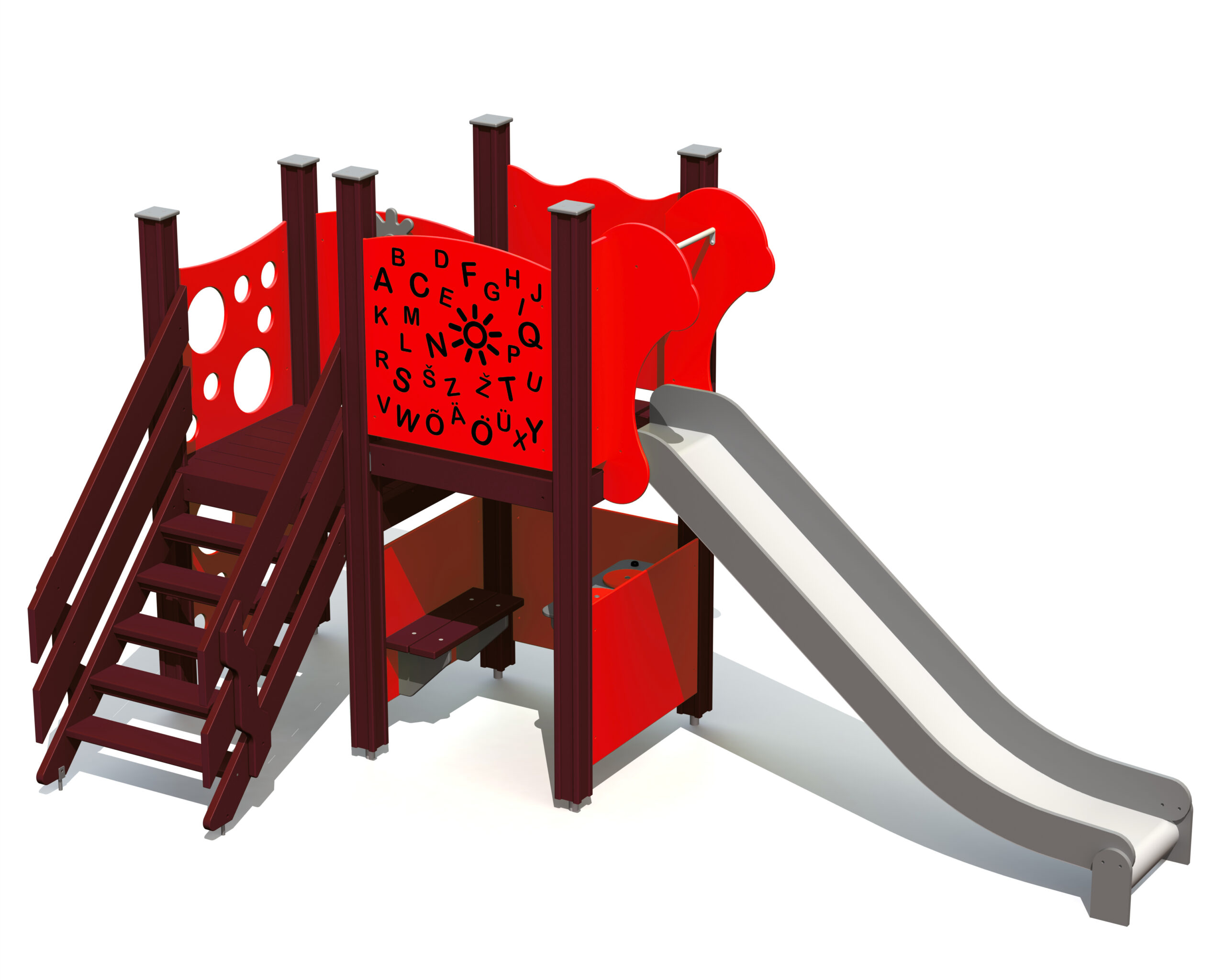 Lekställning Lars består av två plattformar, rutschkana, klättervägg samt trappor med ledstänger. Rutschkanan är utrustad med kaptensroder och en lekhörna med bänk som kan kompletteras med köks- eller bilinstrumentpanel. Sidopanelerna kan bytas ut mot olika aktivitetsväggar eller tematiska tryckta paneler enligt överenskommelse vid beställning.