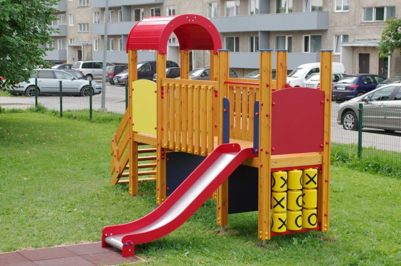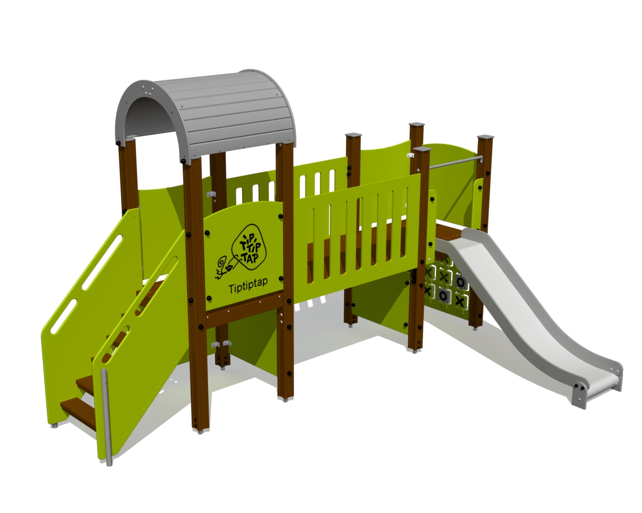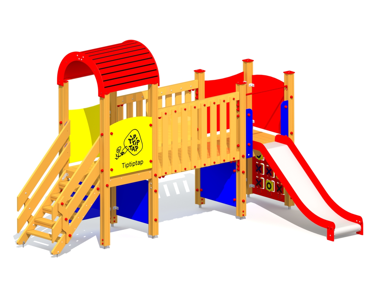 Lekcenter med lång bro, rutschkana och flera aktivitetsväggar som uppmuntrar både rörelselek och kreativt utforskande. Konstruktionen ger barn möjlighet att balansera, klättra och leka tillsammans i en trygg och varierad miljö.