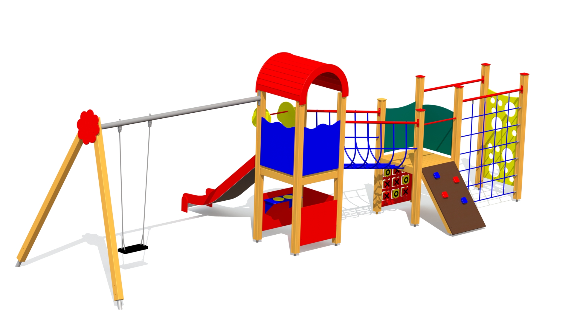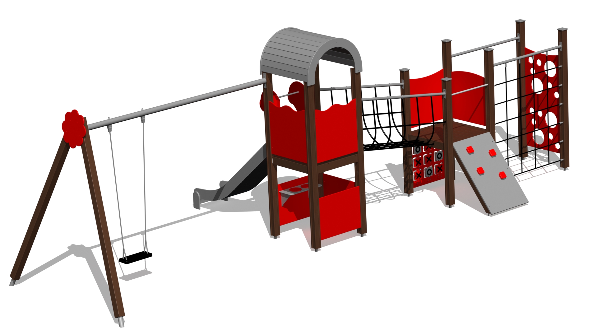 Detta mångsidiga lekcenter med två plattformar, en nätbrygga, en klättervägg, en aktivitetspanel och en gunga erbjuder det bästa alternativet för aktivt spel. Lekcentret kan nås via en bergsklättringsbacke. Dold under den högre plattformen finns en lekhörna med en bänk, som kan förses med köks- eller bilinstrumentpanelselement. En kraftig metallbalk är fäst vid lekplatsen, som rymmer en aluminiumförstärkt gummisits (gungställning KRK2 ingår i priset för denna produkt). Lekcentrets sidopaneler kan växlas till olika aktivitetsväggar eller tematiska tryckta paneler (djur, fåglar, fiskar, träd, bär, etc.). Utformningen av panelerna kommer att slutföras med kunden vid beställning.