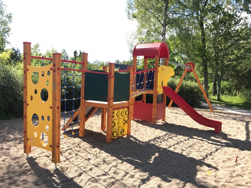 Stort och variationsrikt lekcenter som kombinerar klättring, balans, gunga och rolllek för aktiv och social utelek.